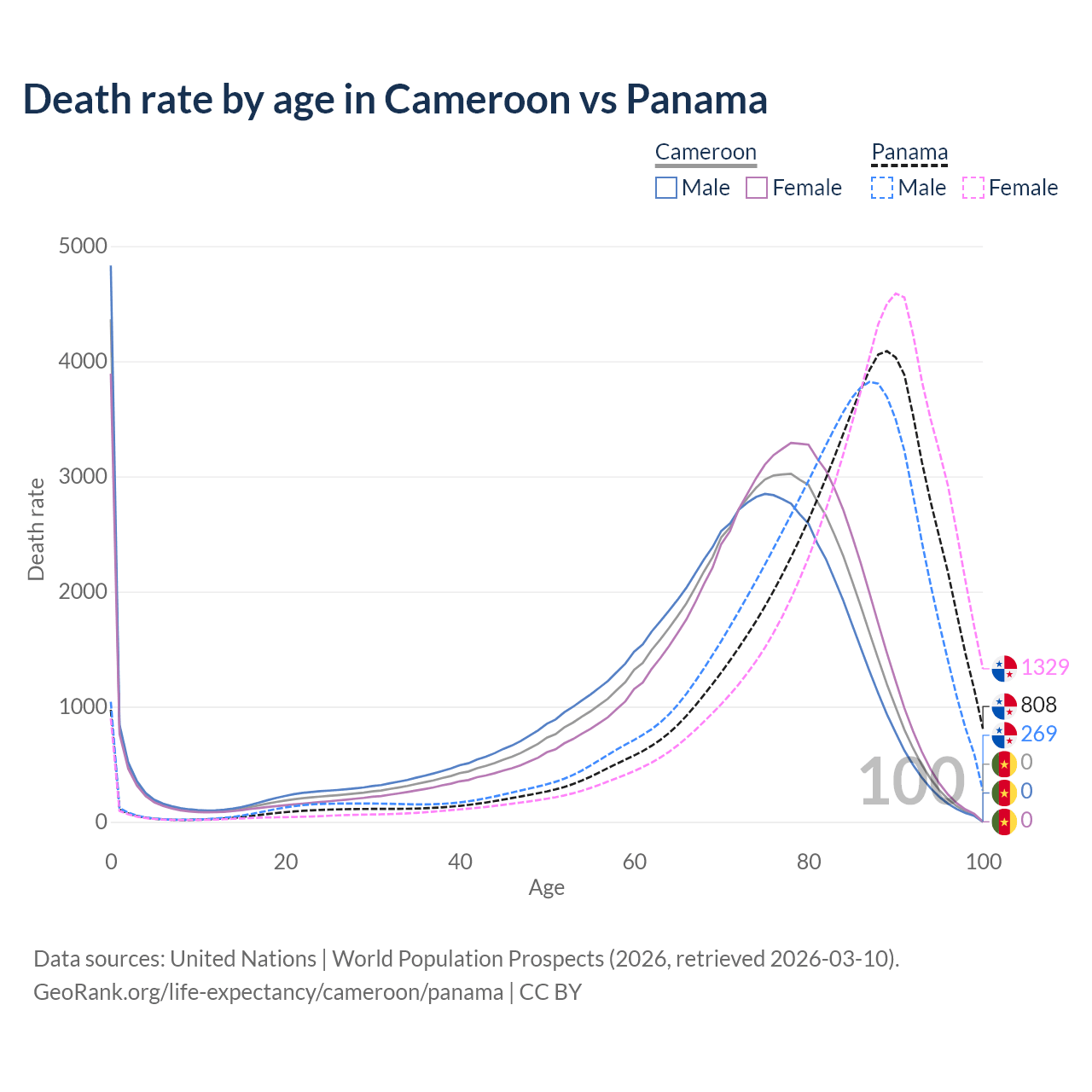 In Cameroon, the most common age of death is 0, compared to 89 in Panama. The median age of death is 71.6 in Cameroon and 84.6 in Panama, meaning only half of each cohort is expected to live past that age.