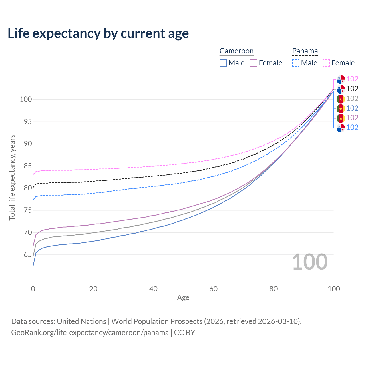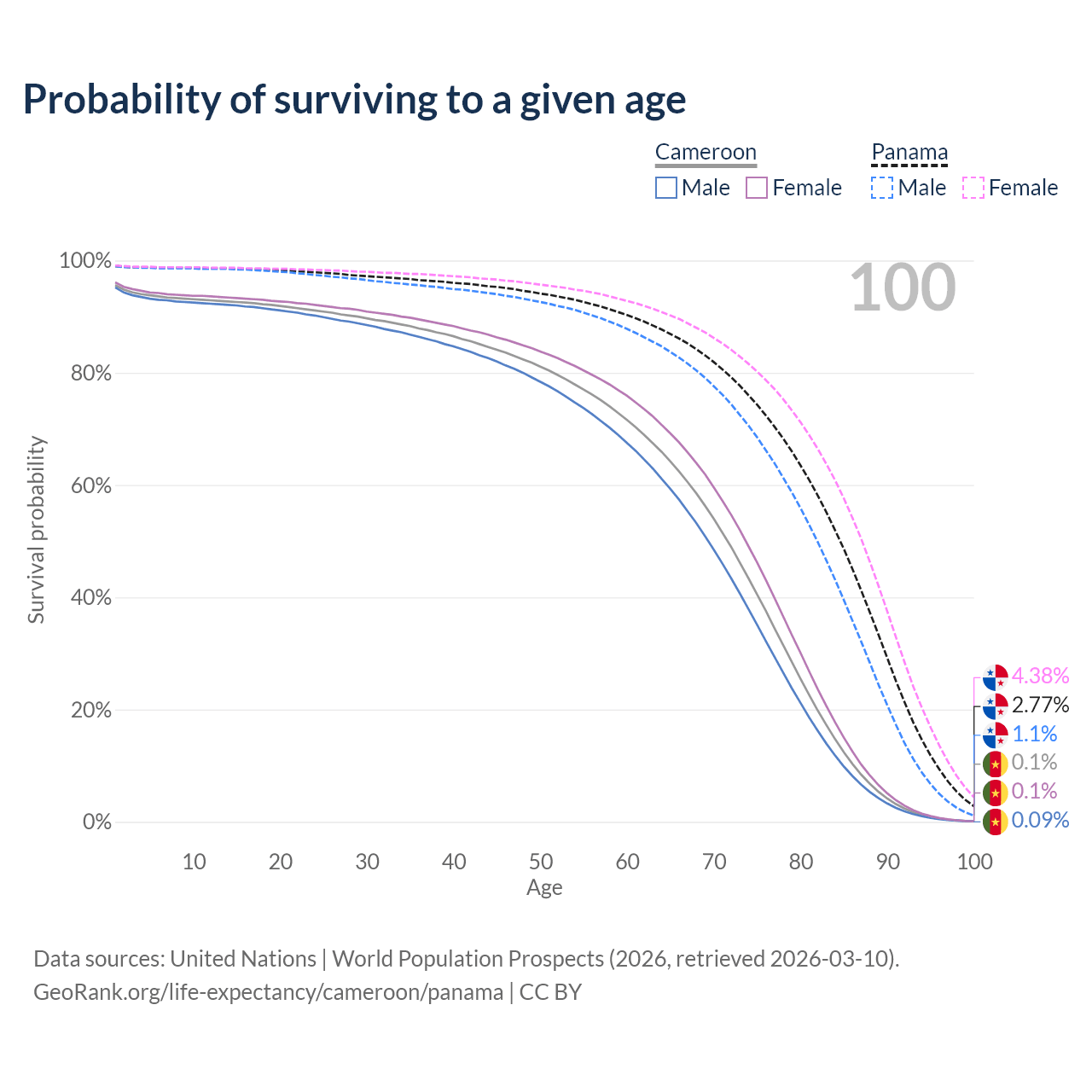 This life expectancy calculator shows the odds of living to 100, 95, 90, and below based on current age for both males and females in Cameroon and Panama, along with mean and median age of death. The calculations are based on the 2026 life tables (actuarial tables) from the UN World Population Prospects.