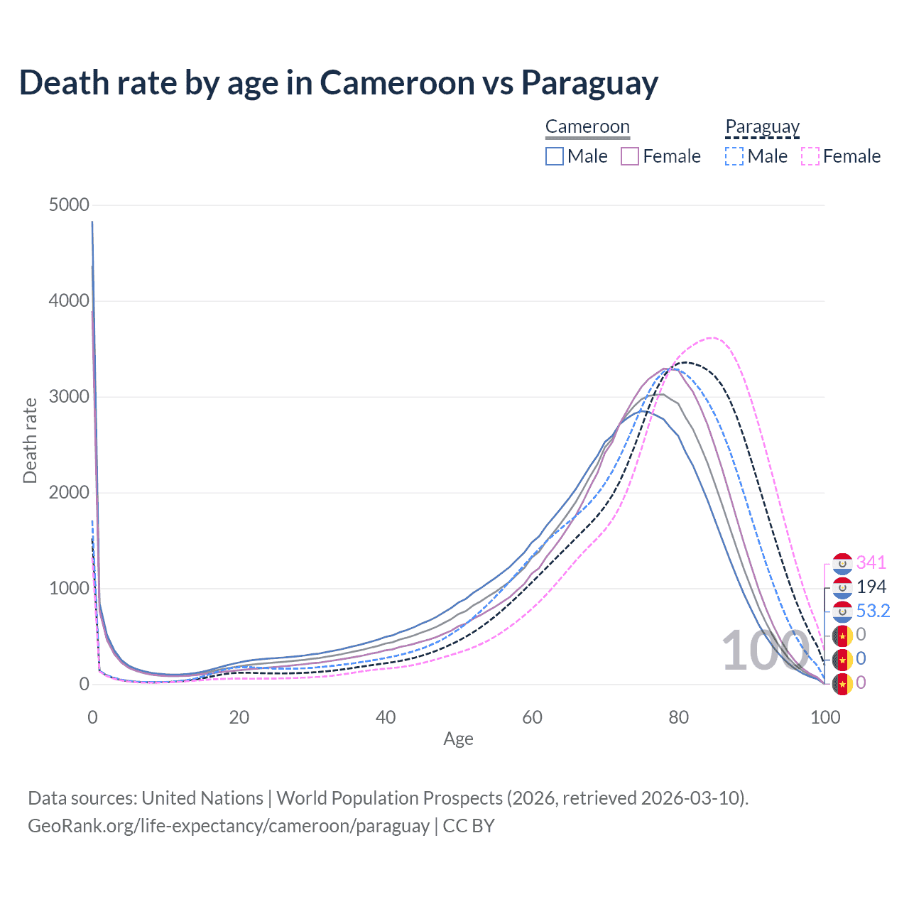 In Cameroon, the most common age of death is 0, compared to 81 in Paraguay. The median age of death is 71.6 in Cameroon and 78.4 in Paraguay, meaning only half of each cohort is expected to live past that age.