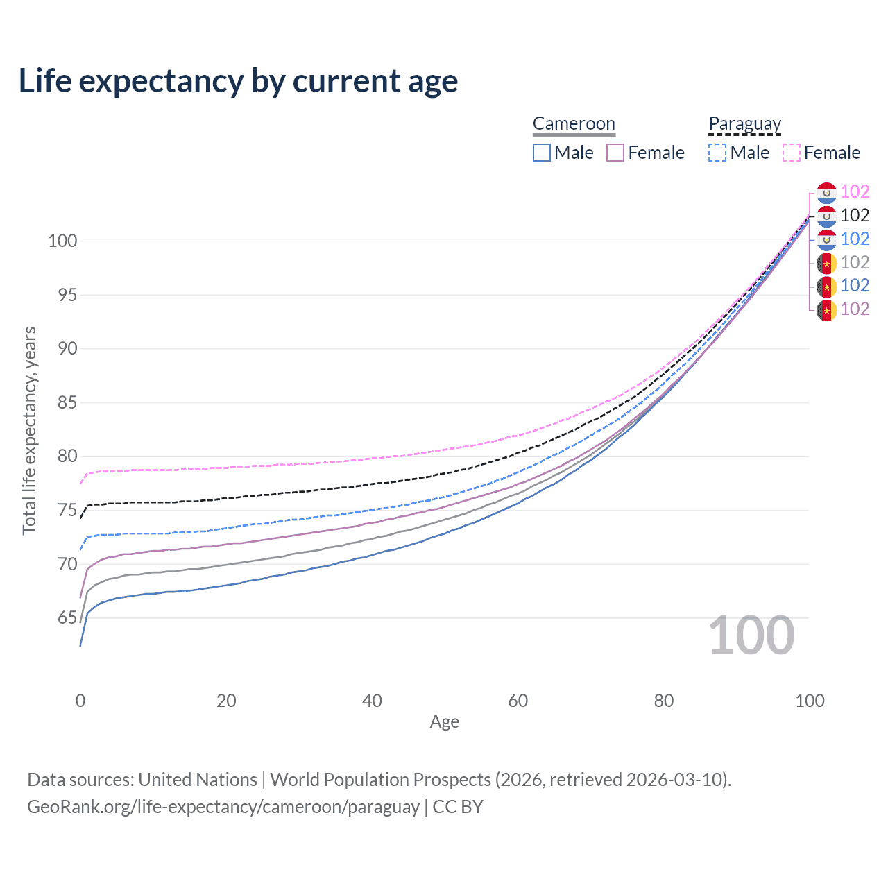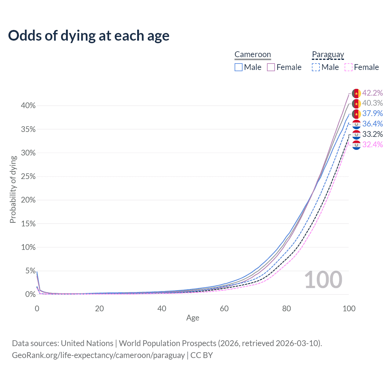 This life expectancy calculator shows the odds of living to 100, 95, 90, and below based on current age for both males and females in Cameroon and Paraguay, along with mean and median age of death. The calculations are based on the 2026 life tables (actuarial tables) from the UN World Population Prospects.