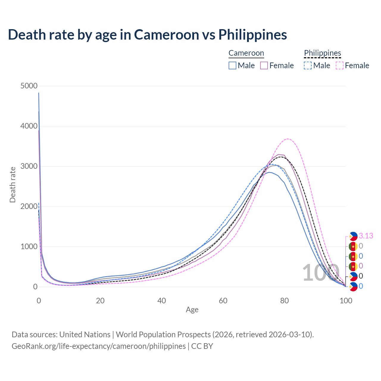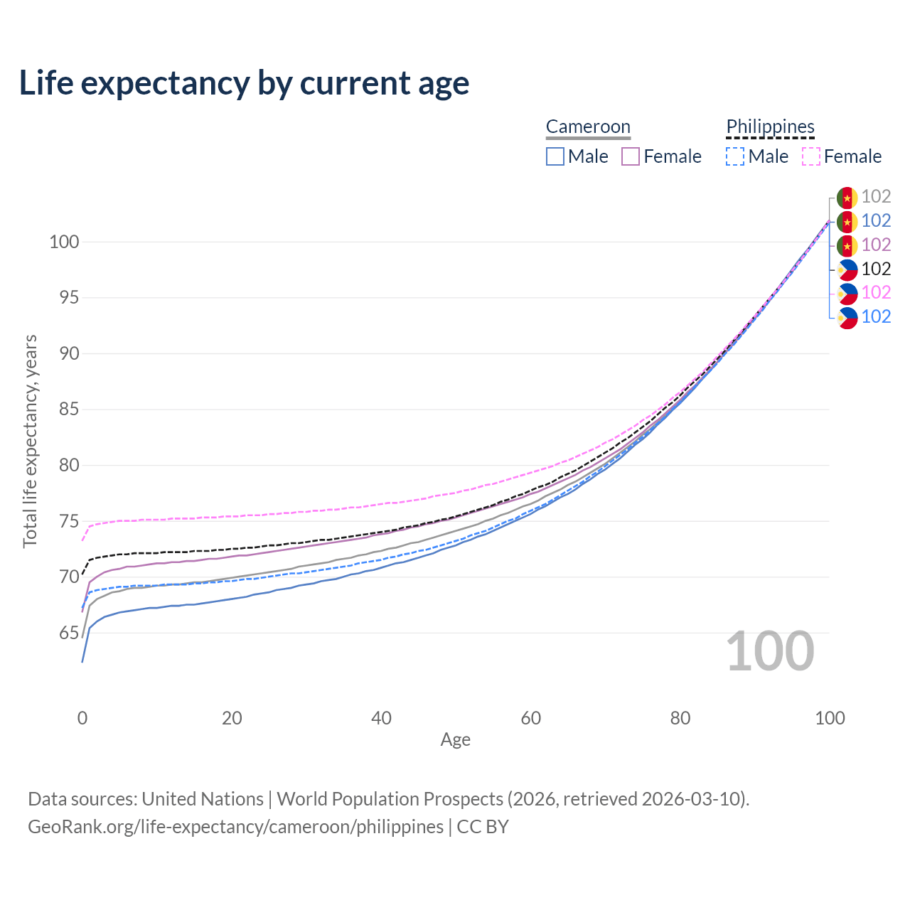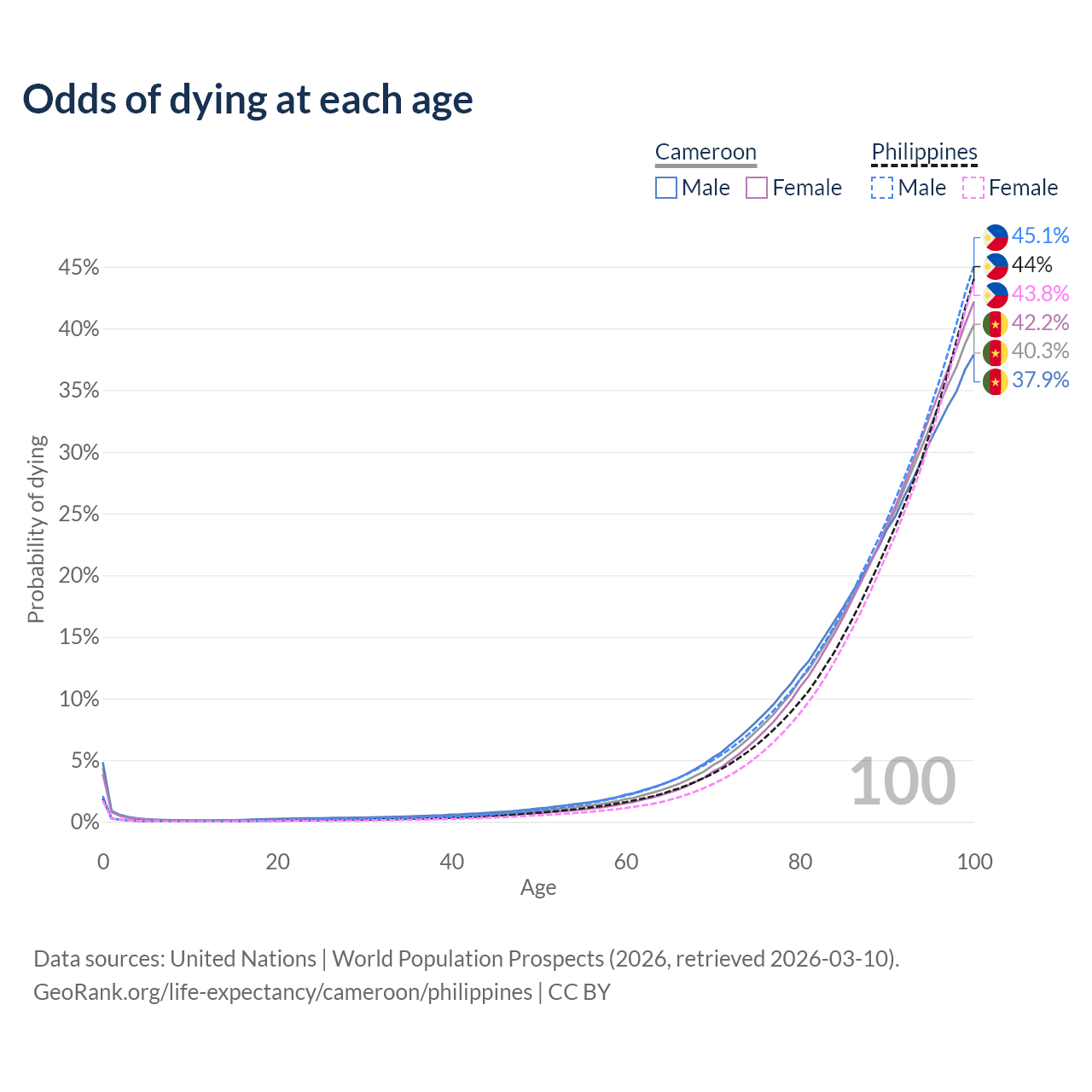 This life expectancy calculator shows the odds of living to 100, 95, 90, and below based on current age for both males and females in Cameroon and the Philippines, along with mean and median age of death. The calculations are based on the 2026 life tables (actuarial tables) from the UN World Population Prospects.