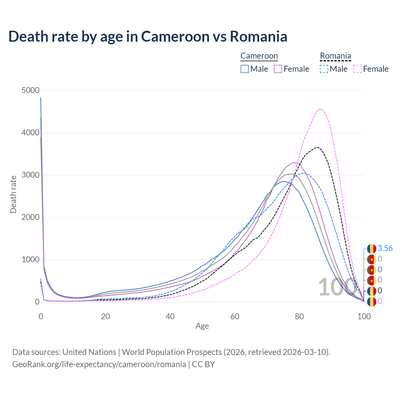This life expectancy calculator shows the odds of living to 100, 95, 90, and below based on current age for both males and females in Cameroon and Romania, along with mean and median age of death. The calculations are based on the 2026 life tables (actuarial tables) from the UN World Population Prospects.