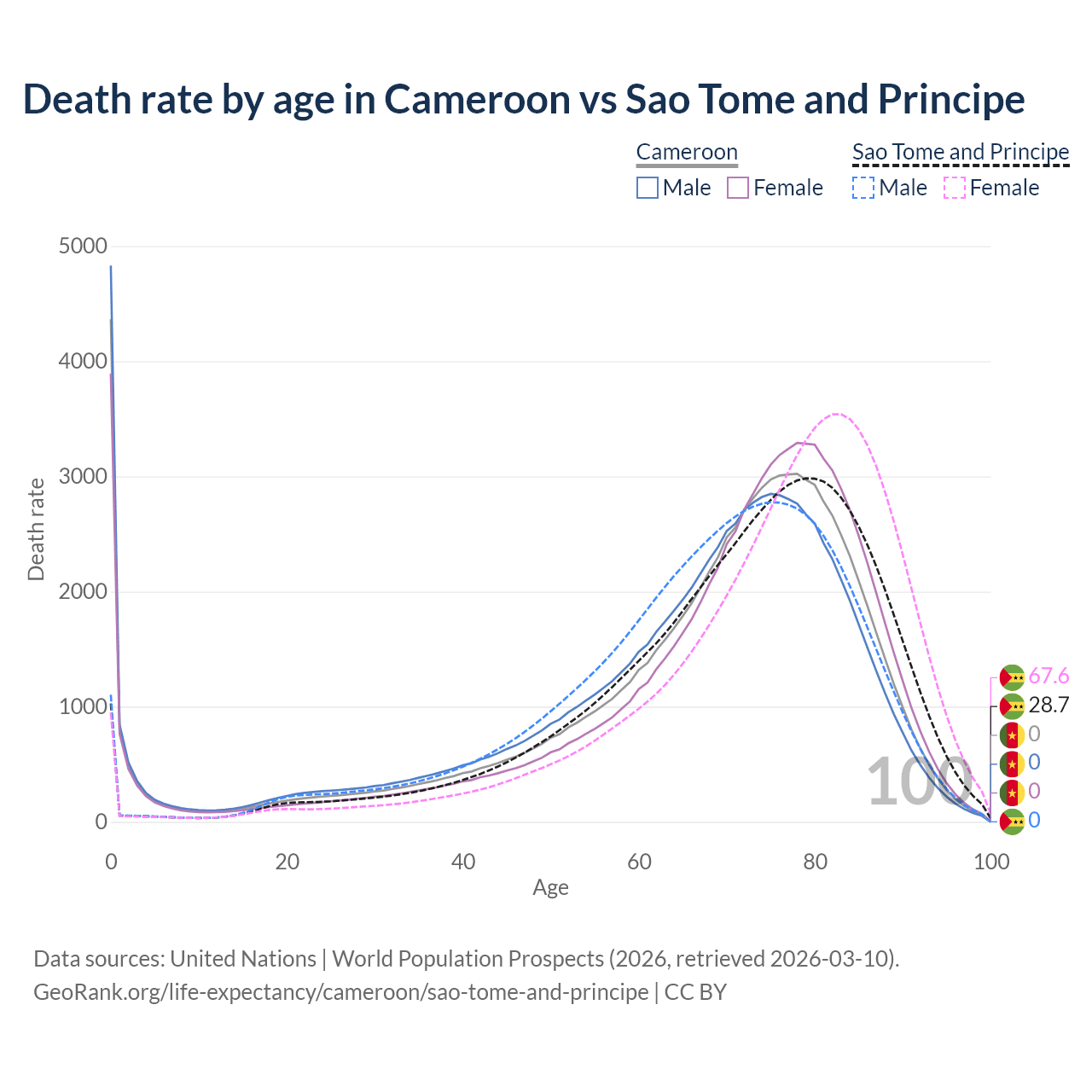 In Cameroon, the most common age of death is 0, compared to 79 in Sao Tome and Principe. The median age of death is 71.6 in Cameroon and 74.1 in Sao Tome and Principe, meaning only half of each cohort is expected to live past that age.