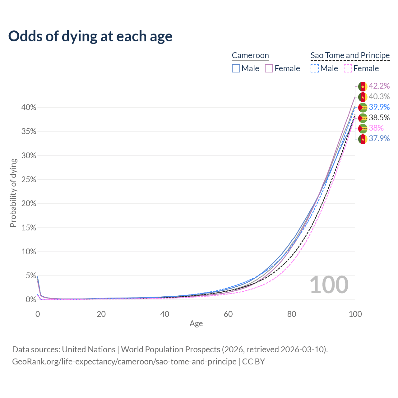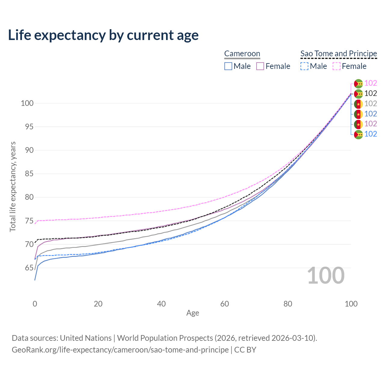 This life expectancy calculator shows the odds of living to 100, 95, 90, and below based on current age for both males and females in Cameroon and Sao Tome and Principe, along with mean and median age of death. The calculations are based on the 2026 life tables (actuarial tables) from the UN World Population Prospects.