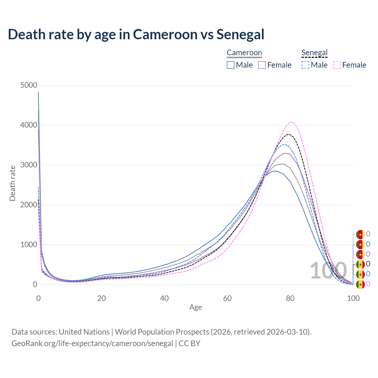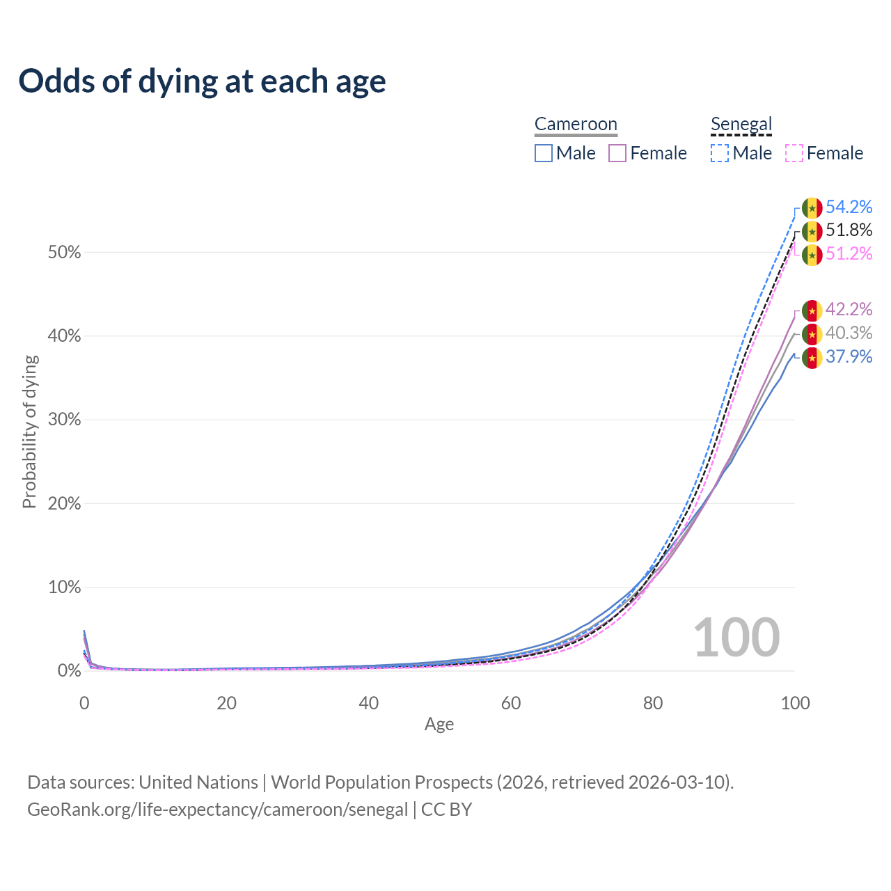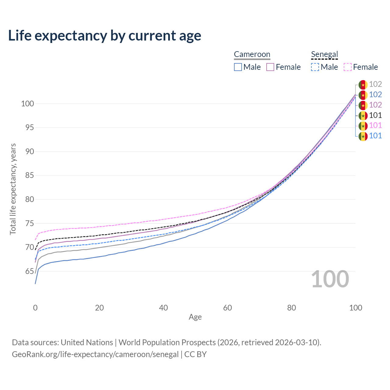 This life expectancy calculator shows the odds of living to 100, 95, 90, and below based on current age for both males and females in Cameroon and Senegal, along with mean and median age of death. The calculations are based on the 2026 life tables (actuarial tables) from the UN World Population Prospects.