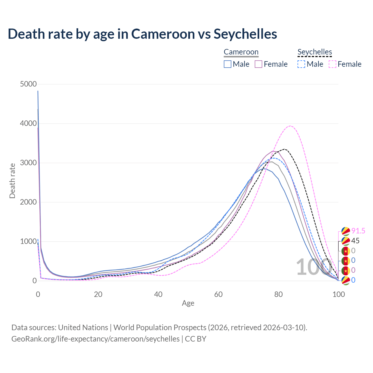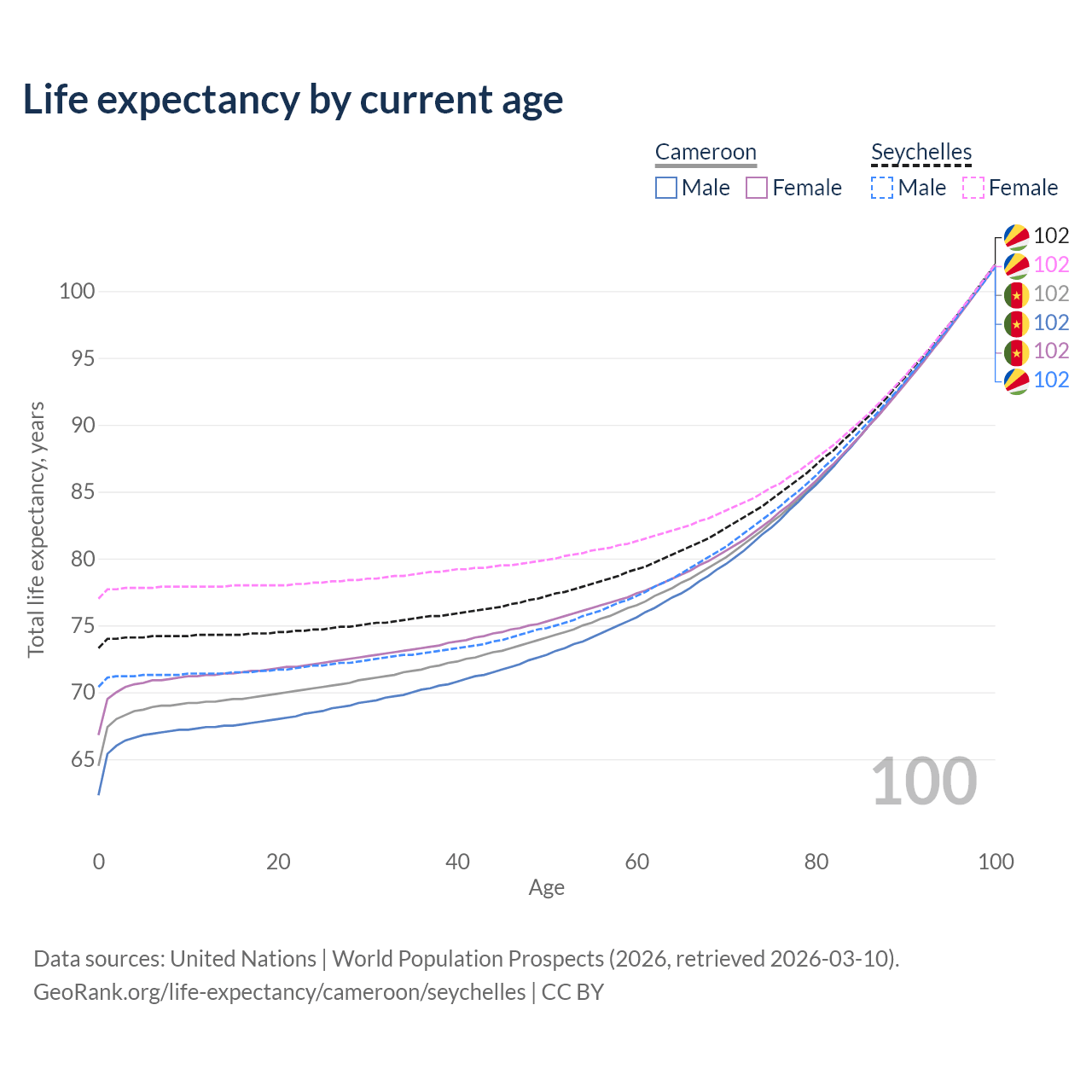 This life expectancy calculator shows the odds of living to 100, 95, 90, and below based on current age for both males and females in Cameroon and the Seychelles, along with mean and median age of death. The calculations are based on the 2026 life tables (actuarial tables) from the UN World Population Prospects.