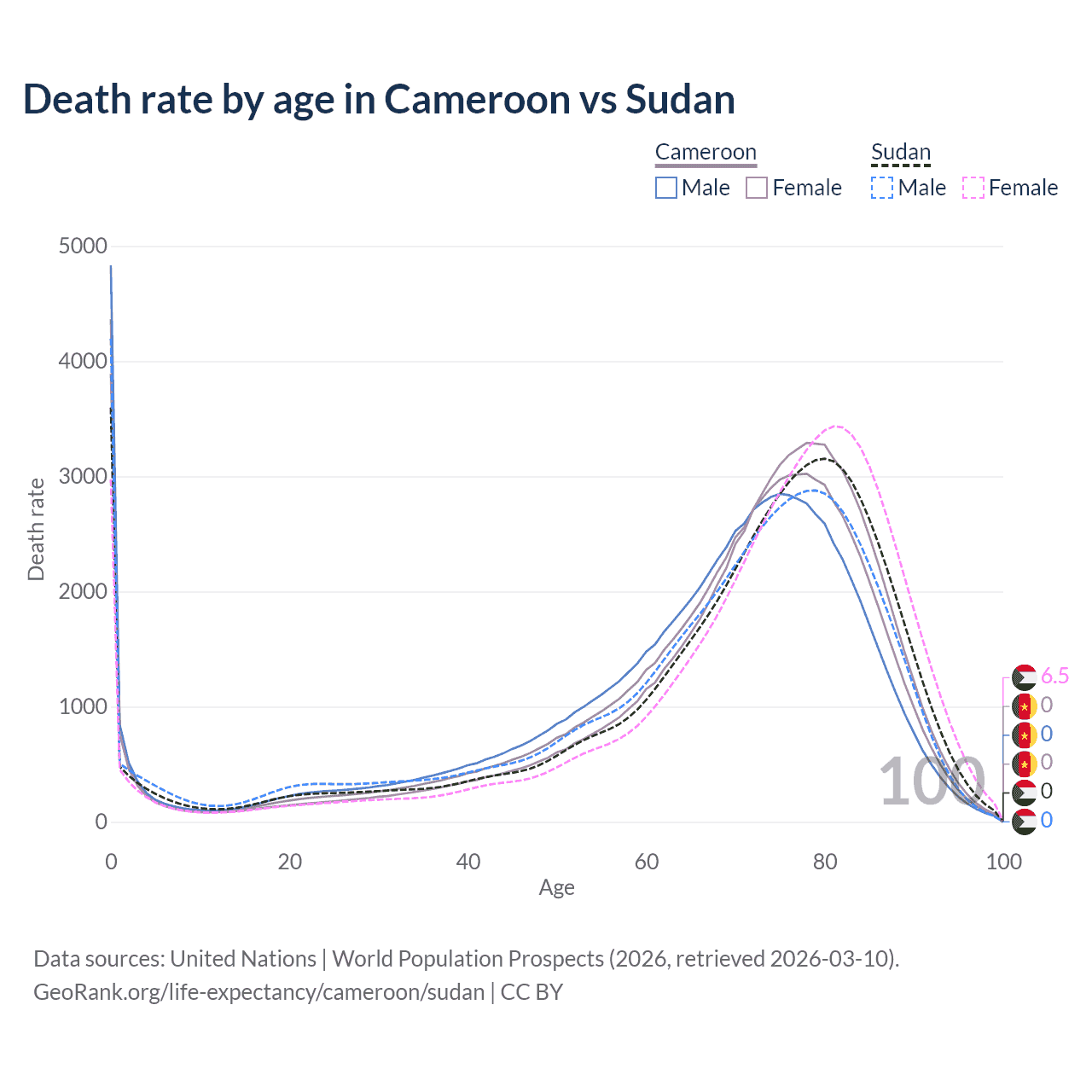 This life expectancy calculator shows the odds of living to 100, 95, 90, and below based on current age for both males and females in Cameroon and Sudan, along with mean and median age of death. The calculations are based on the 2026 life tables (actuarial tables) from the UN World Population Prospects.