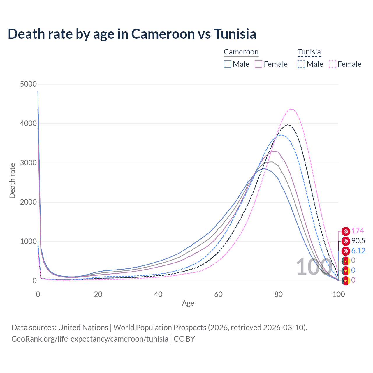 This life expectancy calculator shows the odds of living to 100, 95, 90, and below based on current age for both males and females in Cameroon and Tunisia, along with mean and median age of death. The calculations are based on the 2026 life tables (actuarial tables) from the UN World Population Prospects.