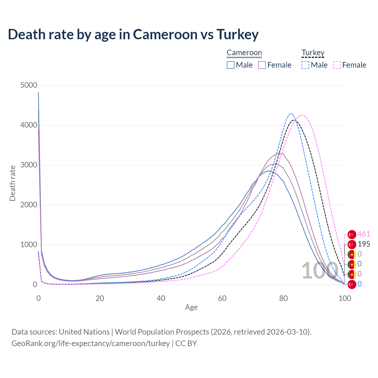 In Cameroon, the most common age of death is 0, compared to 83 in Turkey. The median age of death is 71.6 in Cameroon and 81.4 in Turkey, meaning only half of each cohort is expected to live past that age.