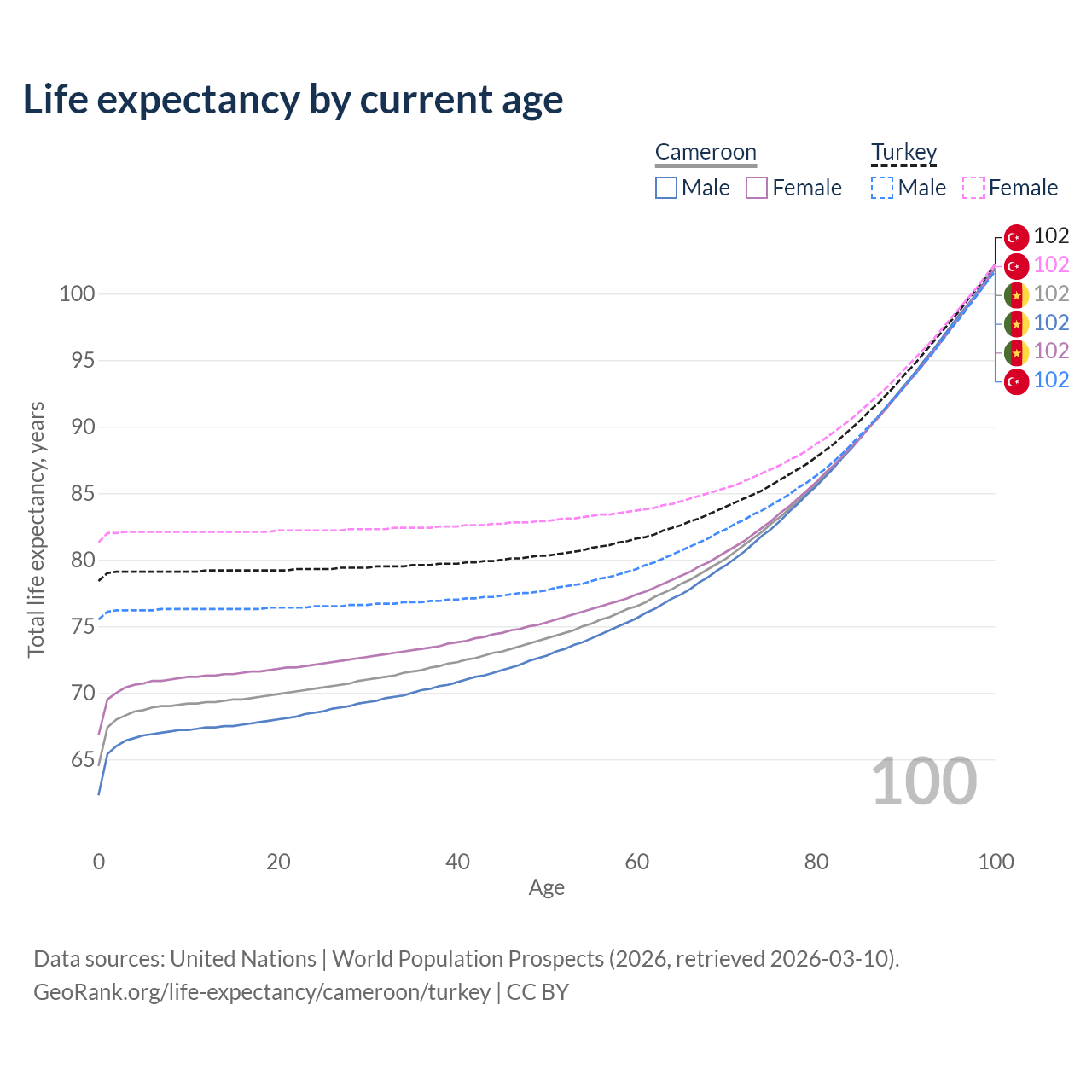 This life expectancy calculator shows the odds of living to 100, 95, 90, and below based on current age for both males and females in Cameroon and Turkey, along with mean and median age of death. The calculations are based on the 2026 life tables (actuarial tables) from the UN World Population Prospects.