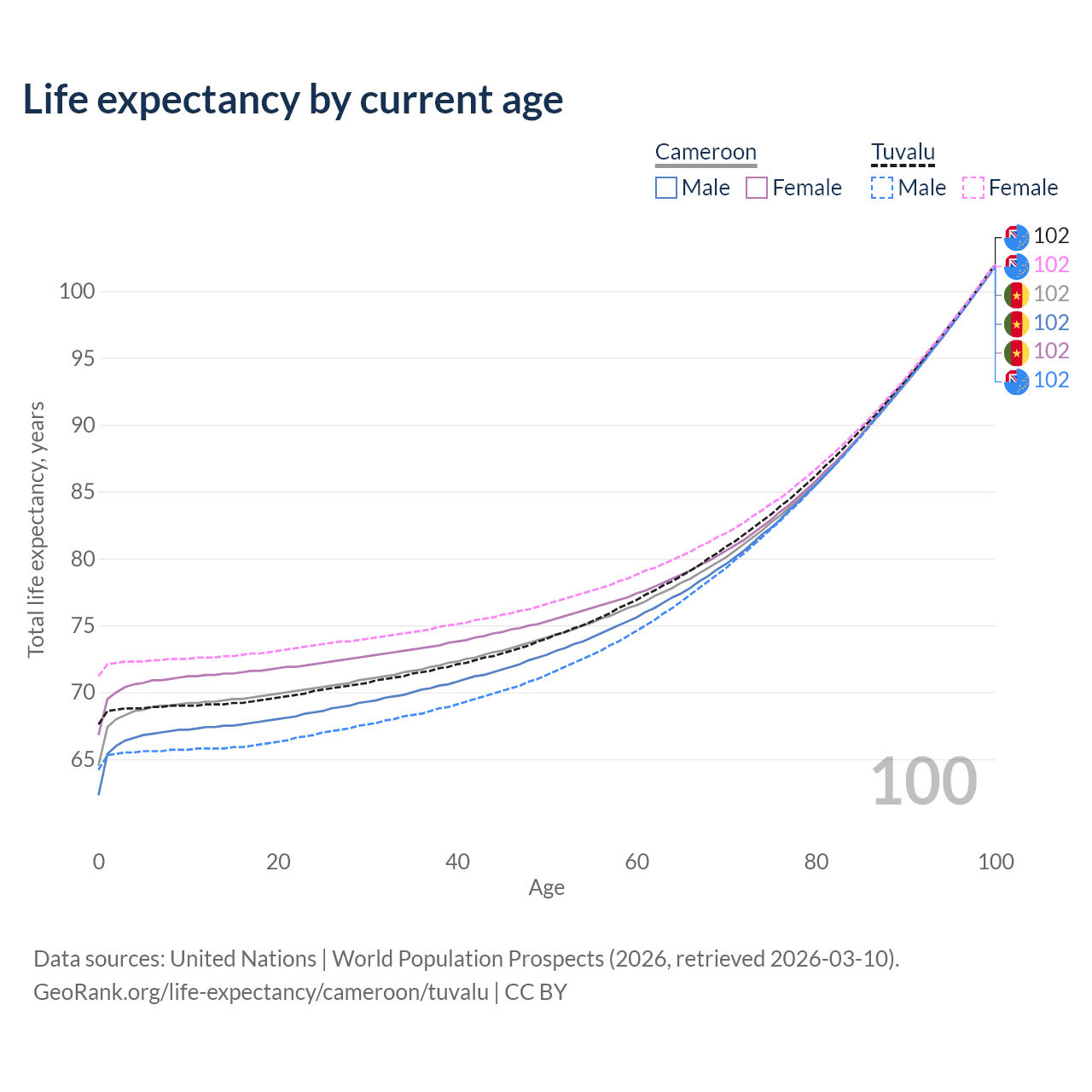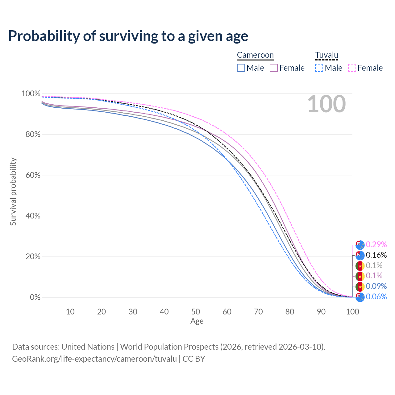 This life expectancy calculator shows the odds of living to 100, 95, 90, and below based on current age for both males and females in Cameroon and Tuvalu, along with mean and median age of death. The calculations are based on the 2026 life tables (actuarial tables) from the UN World Population Prospects.