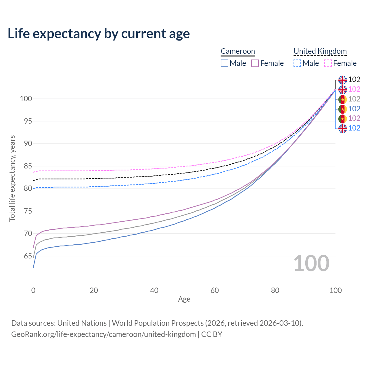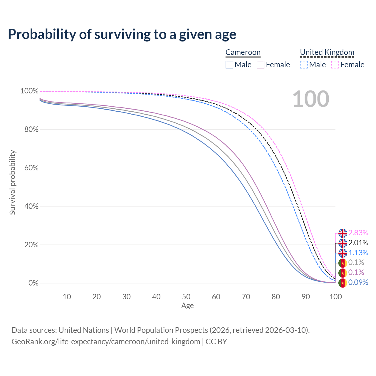 This life expectancy calculator shows the odds of living to 100, 95, 90, and below based on current age for both males and females in Cameroon and the United Kingdom, along with mean and median age of death. The calculations are based on the 2026 life tables (actuarial tables) from the UN World Population Prospects.