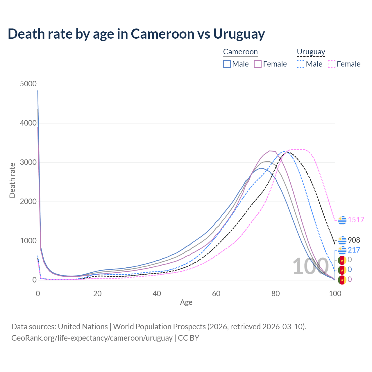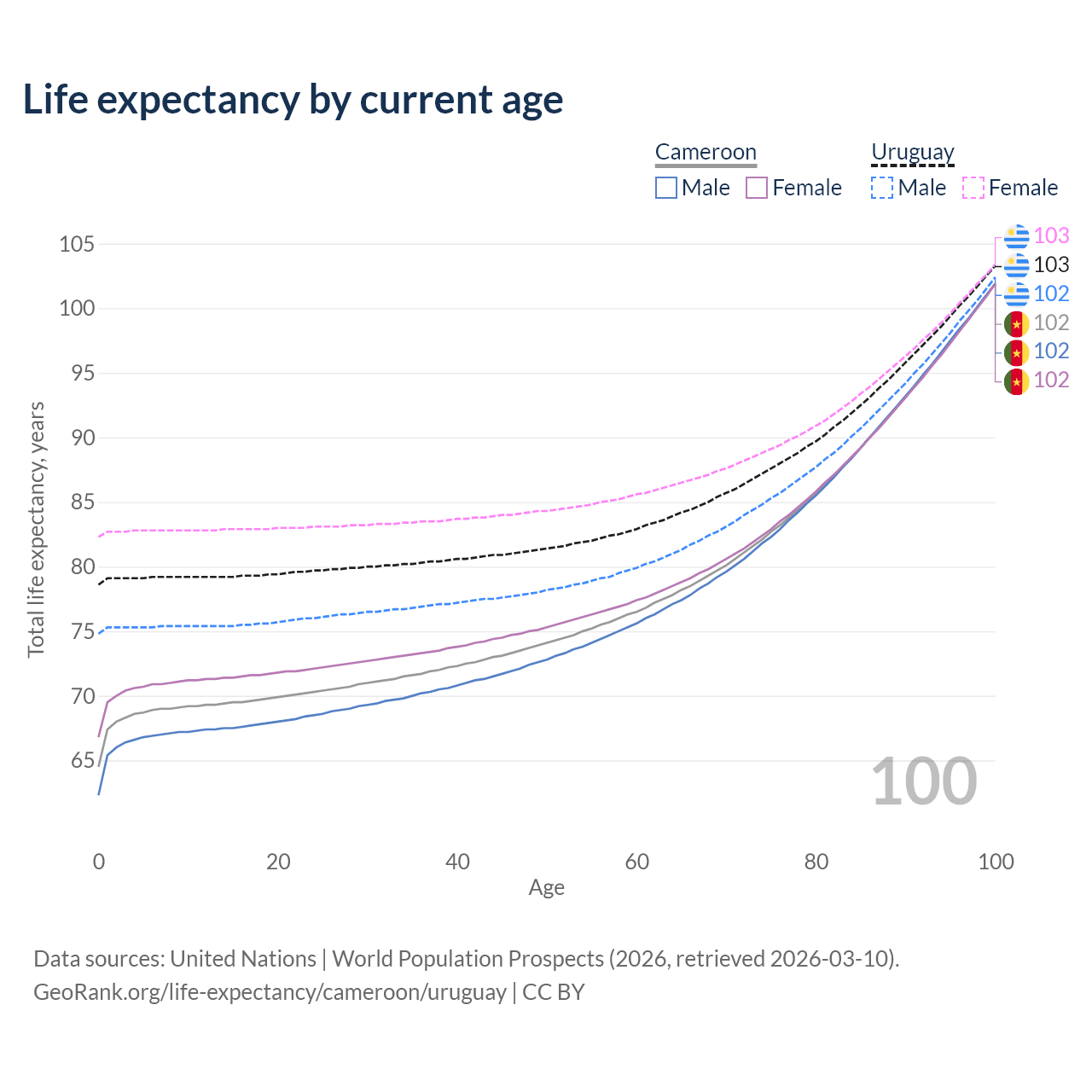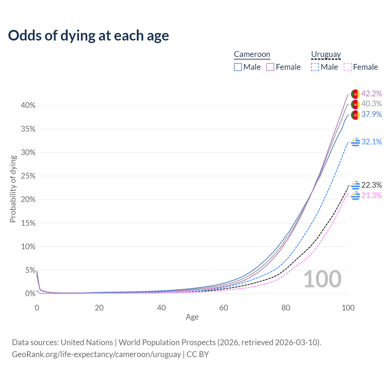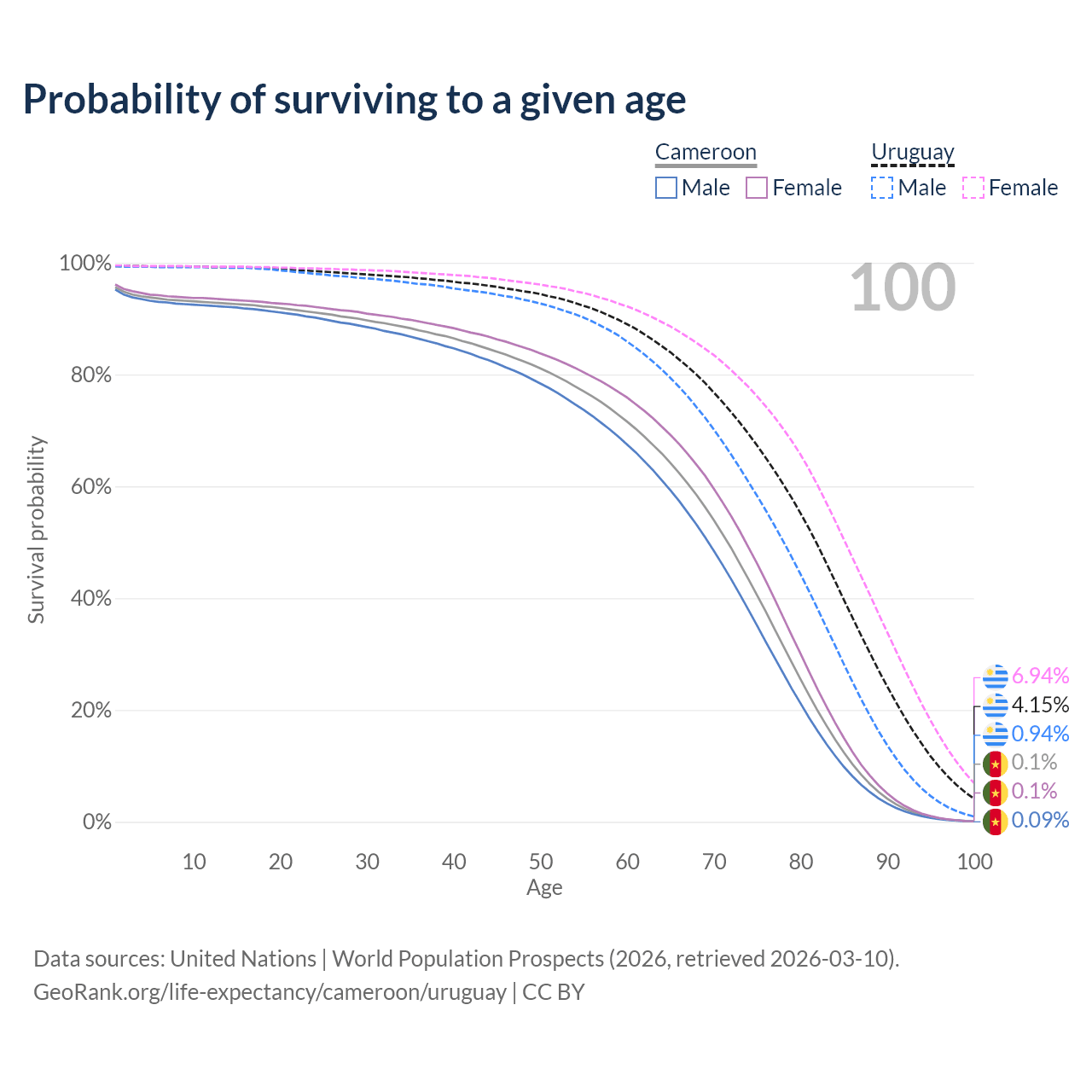 This life expectancy calculator shows the odds of living to 100, 95, 90, and below based on current age for both males and females in Cameroon and Uruguay, along with mean and median age of death. The calculations are based on the 2026 life tables (actuarial tables) from the UN World Population Prospects.