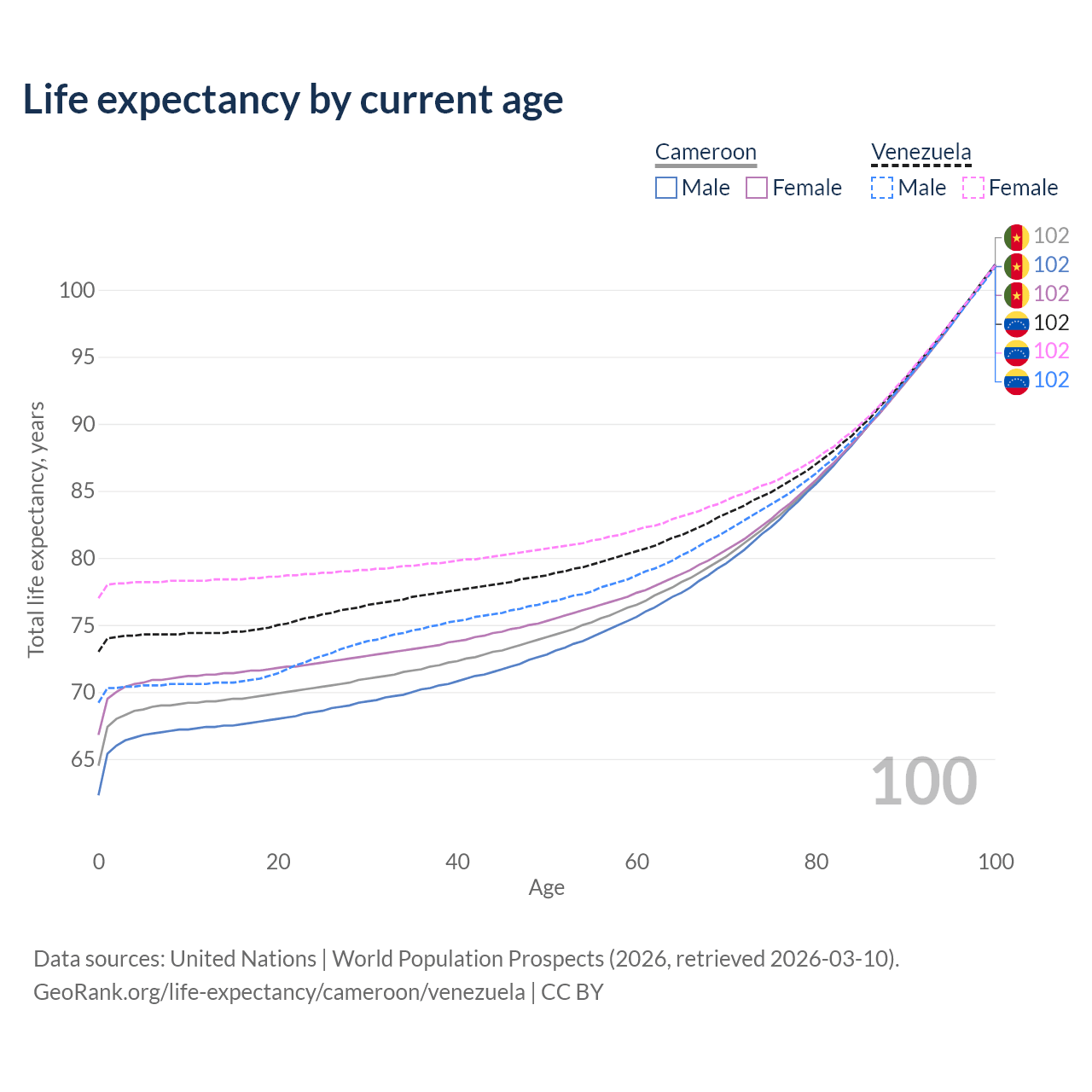 This life expectancy calculator shows the odds of living to 100, 95, 90, and below based on current age for both males and females in Cameroon and Venezuela, along with mean and median age of death. The calculations are based on the 2026 life tables (actuarial tables) from the UN World Population Prospects.