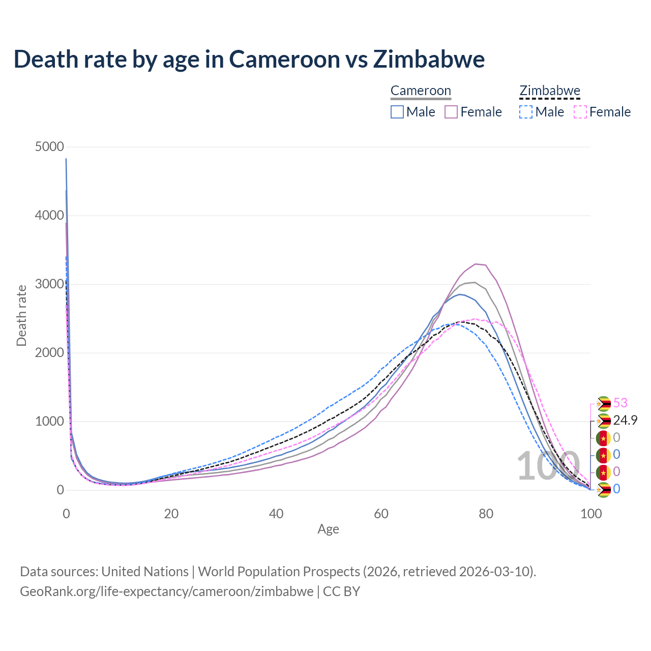 In Cameroon, the most common age of death is 0, compared to 0 in Zimbabwe. The median age of death is 71.6 in Cameroon and 68.8 in Zimbabwe, meaning only half of each cohort is expected to live past that age.