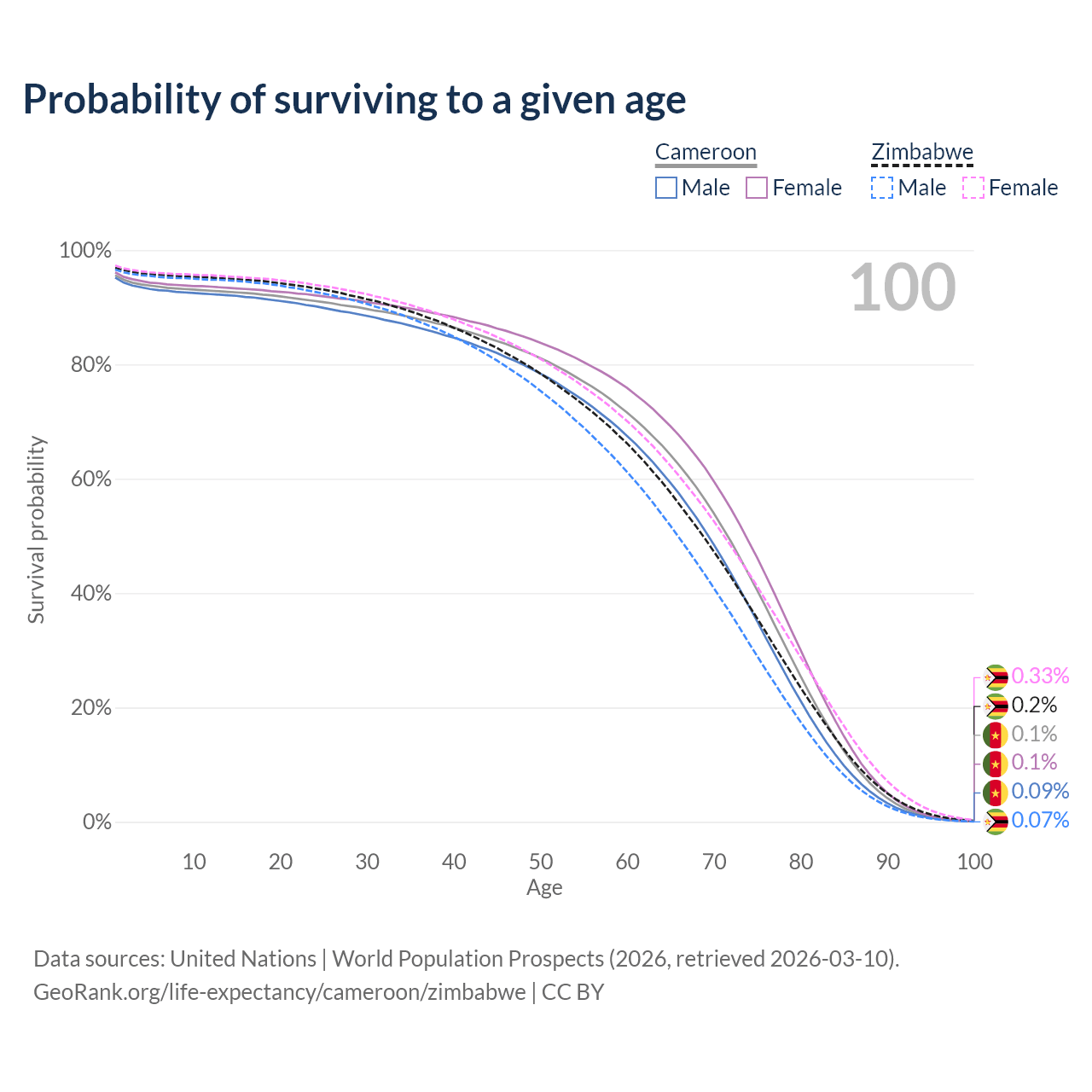 This life expectancy calculator shows the odds of living to 100, 95, 90, and below based on current age for both males and females in Cameroon and Zimbabwe, along with mean and median age of death. The calculations are based on the 2026 life tables (actuarial tables) from the UN World Population Prospects.