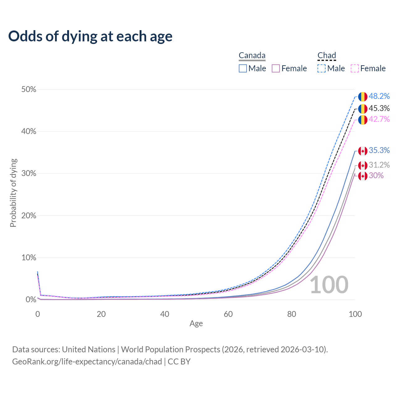This life expectancy calculator shows the odds of living to 100, 95, 90, and below based on current age for both males and females in Canada and Chad, along with mean and median age of death. The calculations are based on the 2026 life tables (actuarial tables) from the UN World Population Prospects.