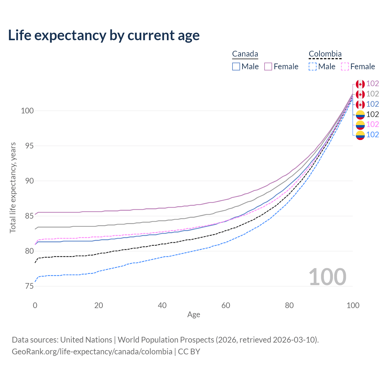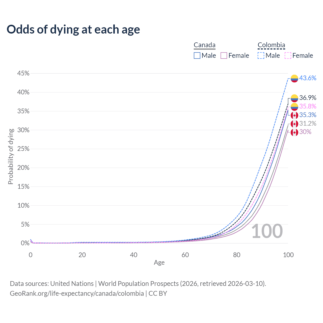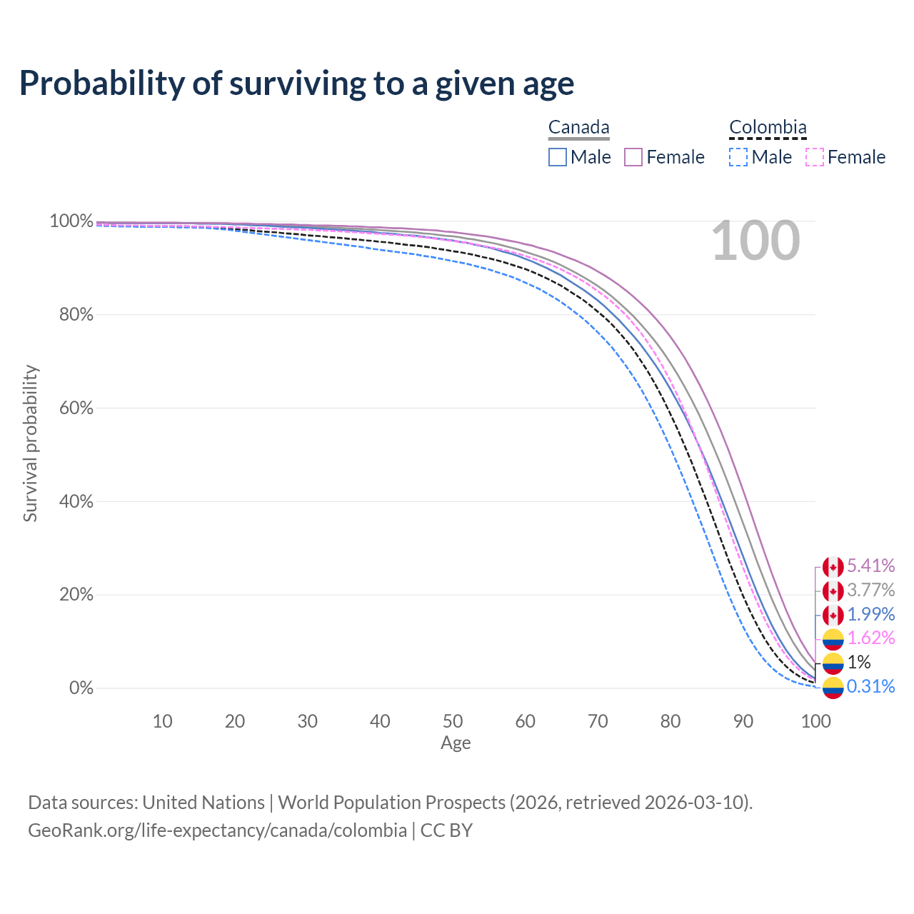 This life expectancy calculator shows the odds of living to 100, 95, 90, and below based on current age for both males and females in Canada and Colombia, along with mean and median age of death. The calculations are based on the 2026 life tables (actuarial tables) from the UN World Population Prospects.