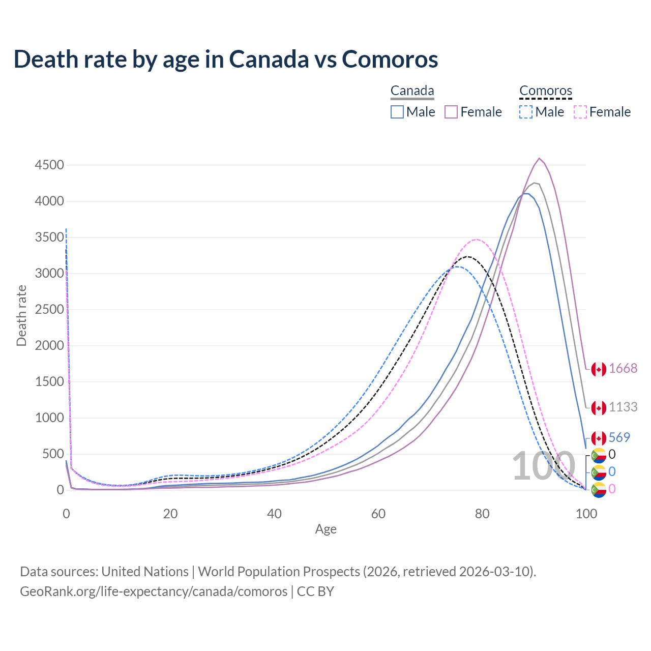 In Canada, the most common age of death is 90, compared to 0 in Comoros. The median age of death is 86.4 in Canada and 72.9 in Comoros, meaning only half of each cohort is expected to live past that age.