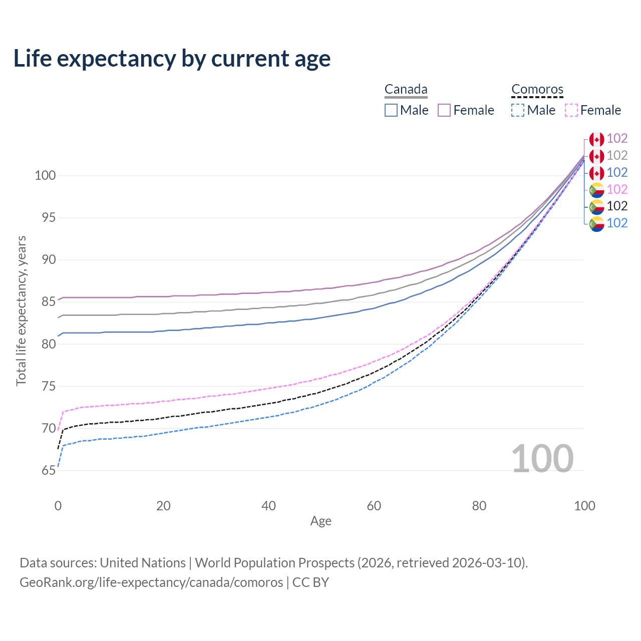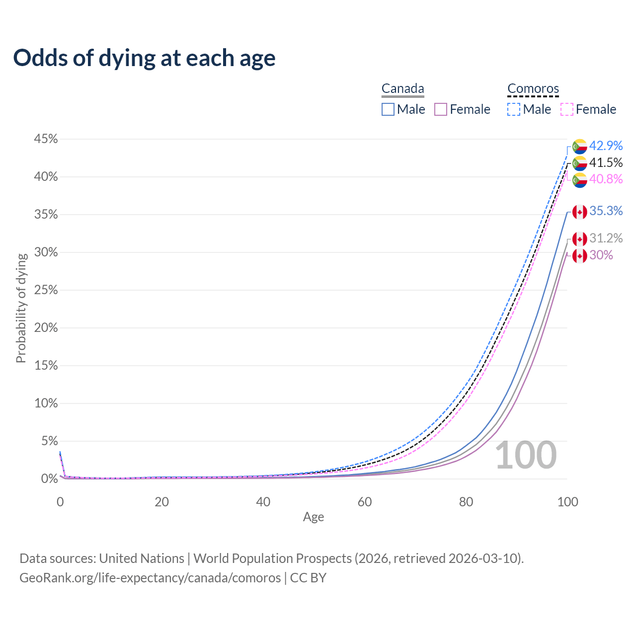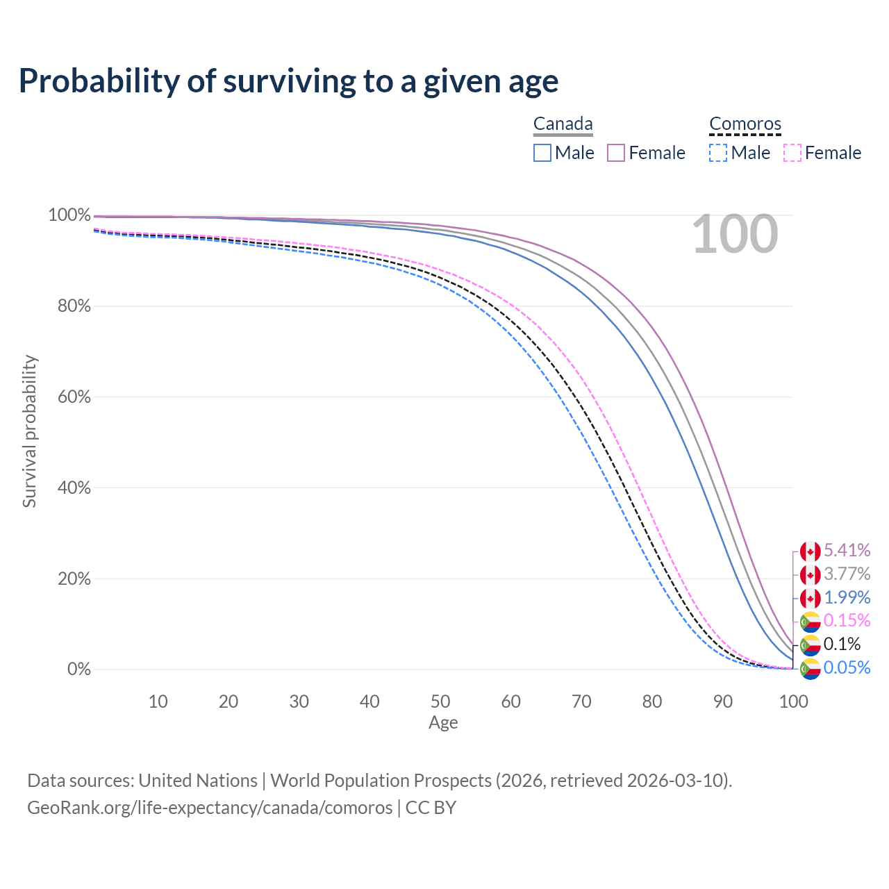 This life expectancy calculator shows the odds of living to 100, 95, 90, and below based on current age for both males and females in Canada and Comoros, along with mean and median age of death. The calculations are based on the 2026 life tables (actuarial tables) from the UN World Population Prospects.