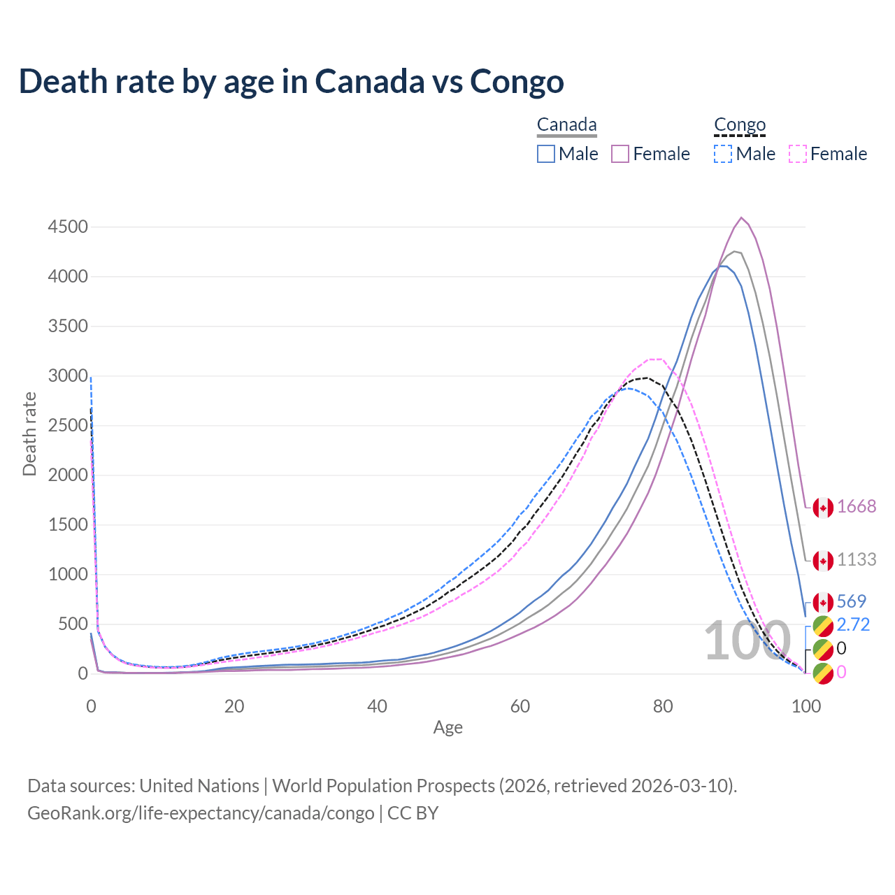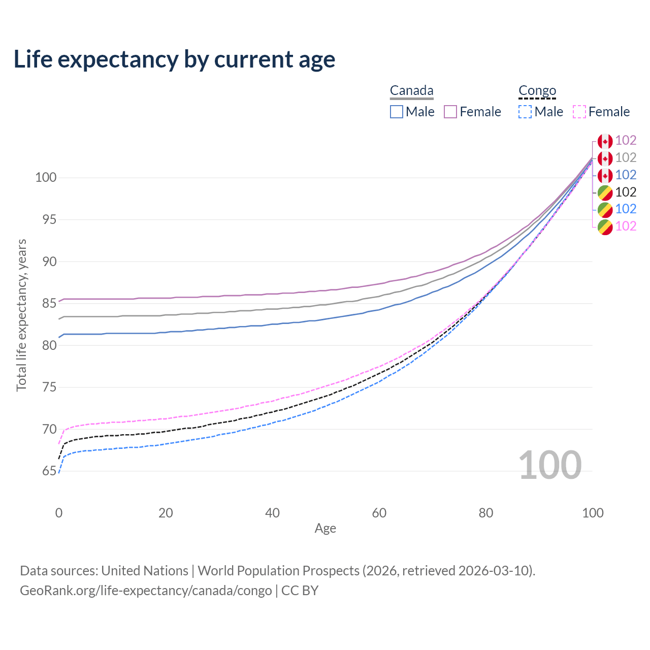 This life expectancy calculator shows the odds of living to 100, 95, 90, and below based on current age for both males and females in Canada and the Congo, along with mean and median age of death. The calculations are based on the 2026 life tables (actuarial tables) from the UN World Population Prospects.