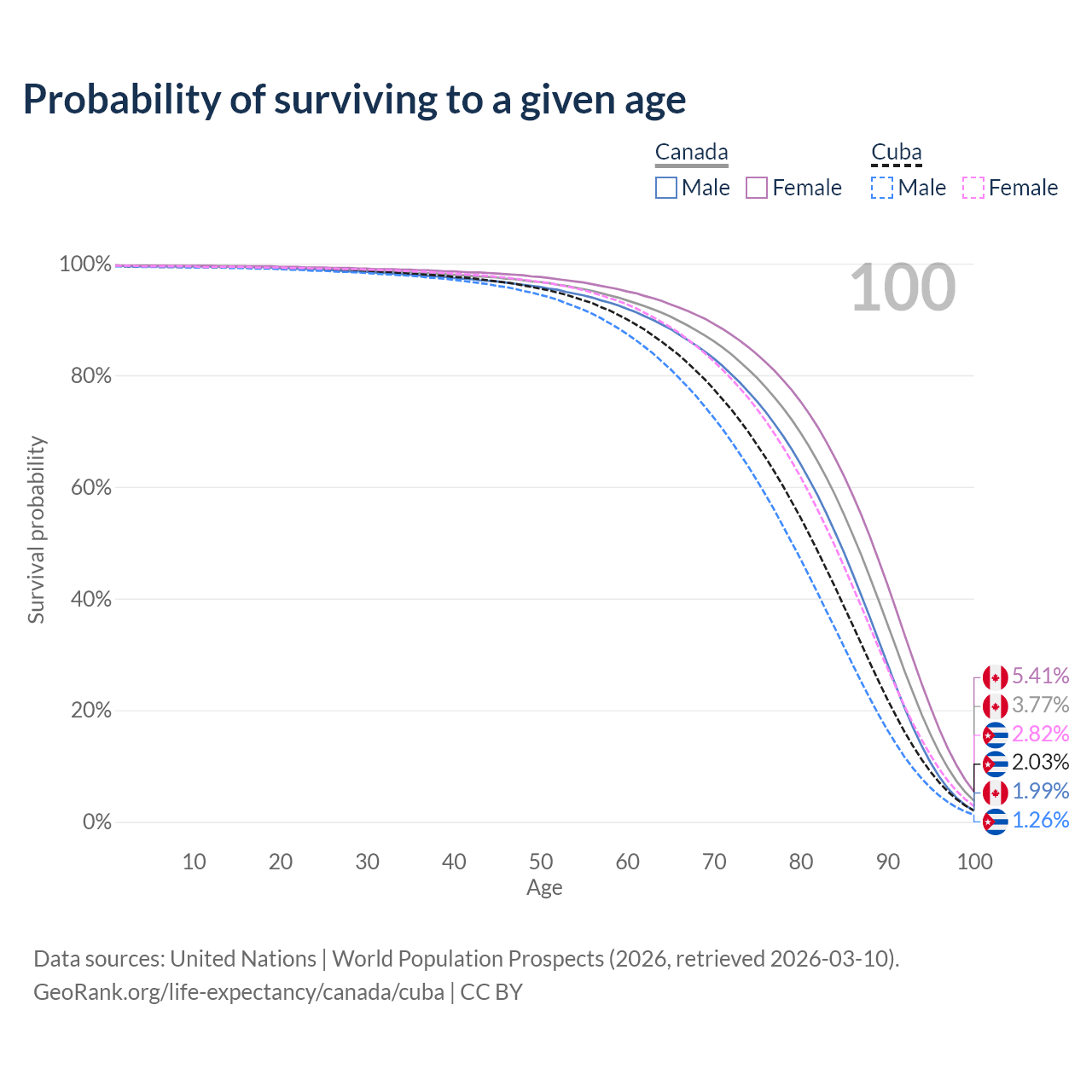 This life expectancy calculator shows the odds of living to 100, 95, 90, and below based on current age for both males and females in Canada and Cuba, along with mean and median age of death. The calculations are based on the 2026 life tables (actuarial tables) from the UN World Population Prospects.