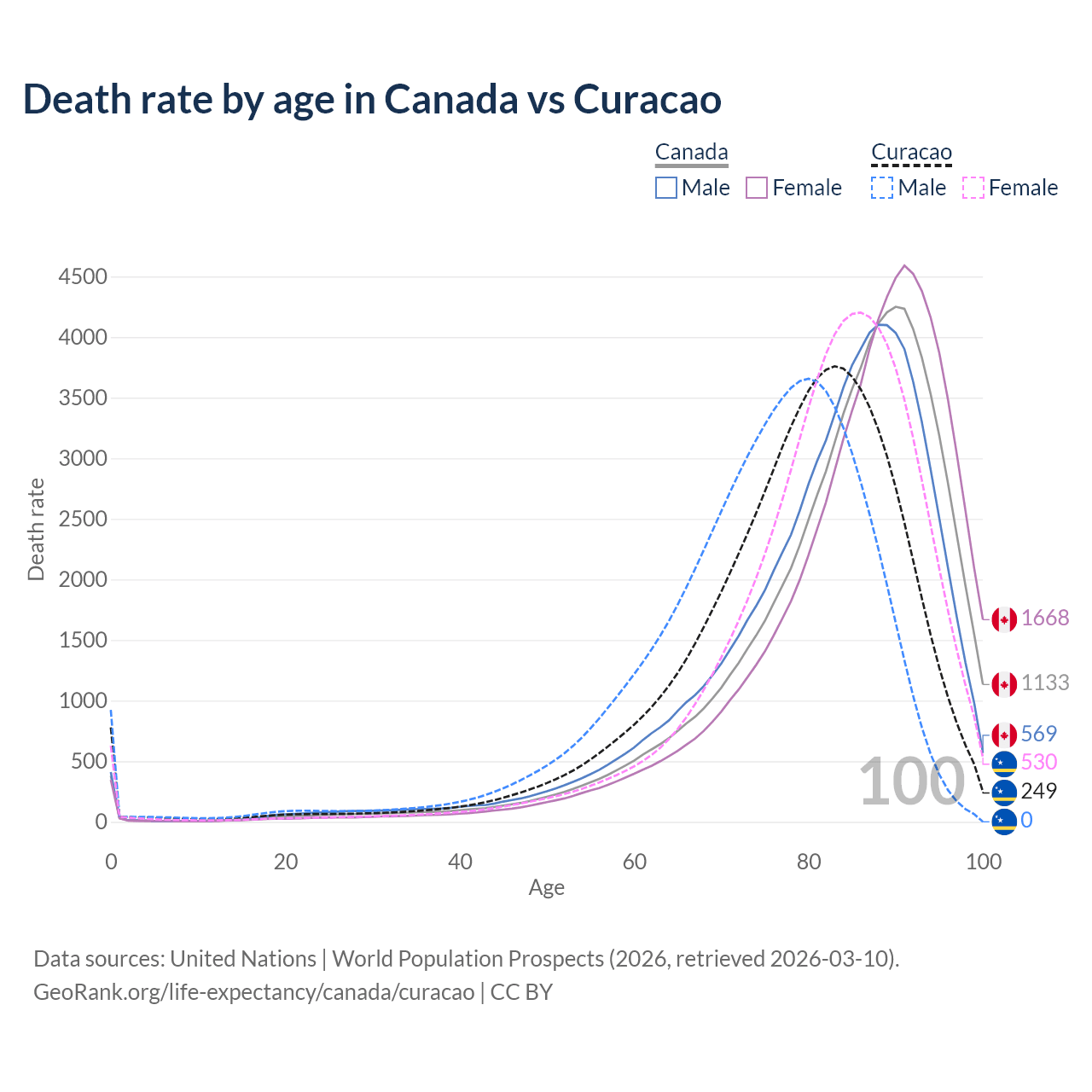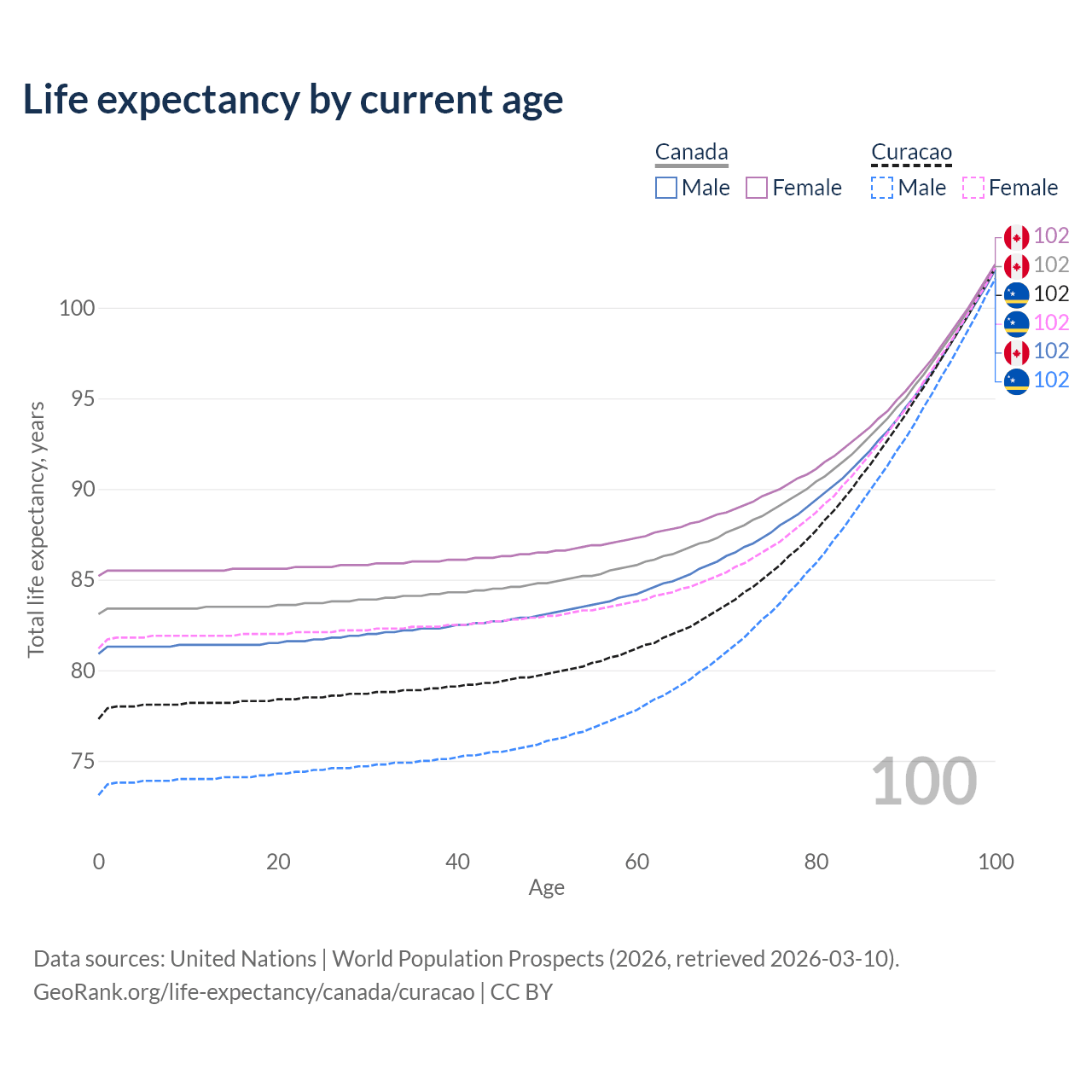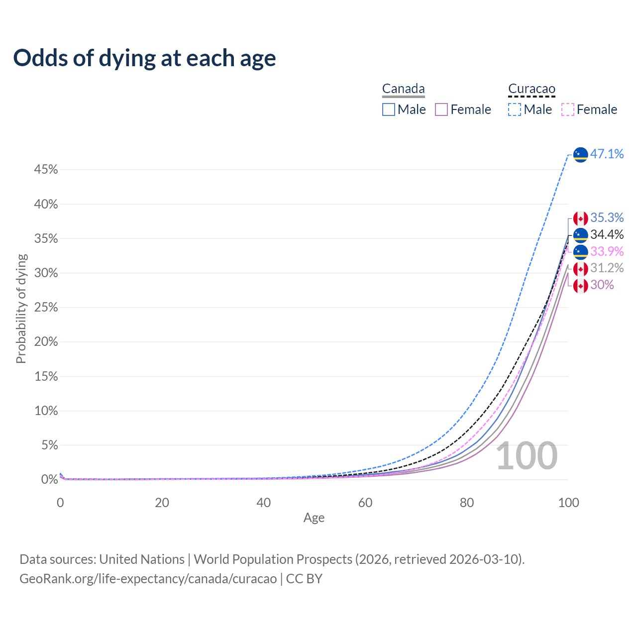 This life expectancy calculator shows the odds of living to 100, 95, 90, and below based on current age for both males and females in Canada and Curacao, along with mean and median age of death. The calculations are based on the 2026 life tables (actuarial tables) from the UN World Population Prospects.