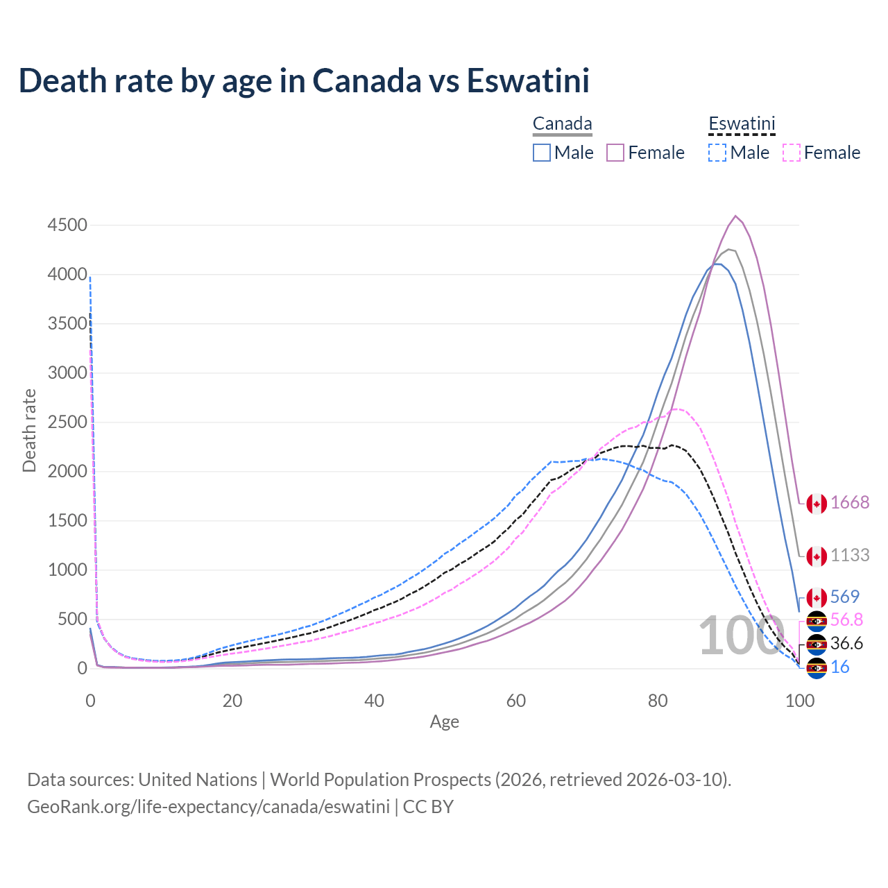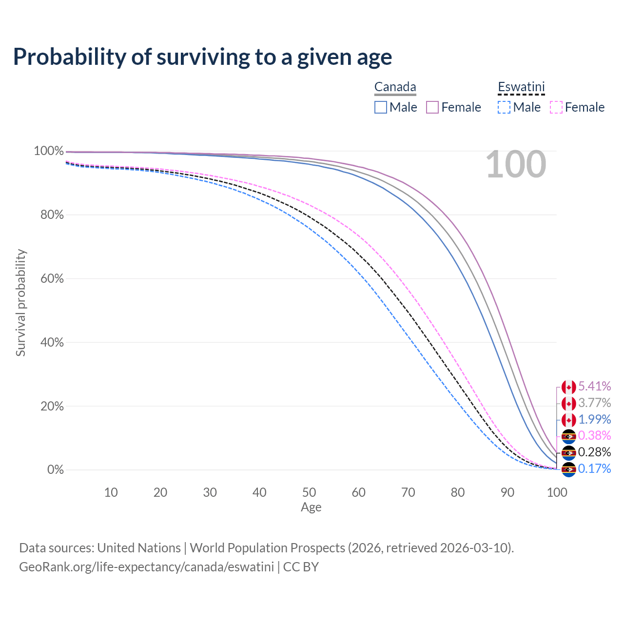 This life expectancy calculator shows the odds of living to 100, 95, 90, and below based on current age for both males and females in Canada and Eswatini, along with mean and median age of death. The calculations are based on the 2026 life tables (actuarial tables) from the UN World Population Prospects.