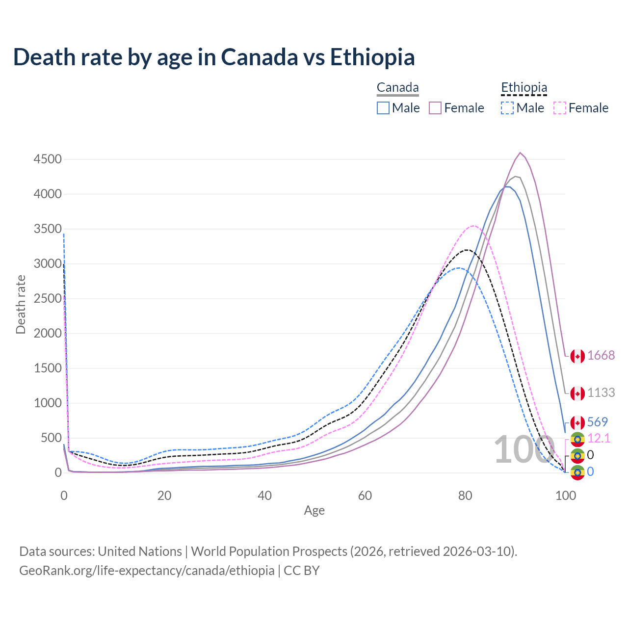 Note that this chart does not show rates per 100,000 population, as those would be skewed by age structure differences and reflect the demographics of Canada and Ethiopia more than their death rates.