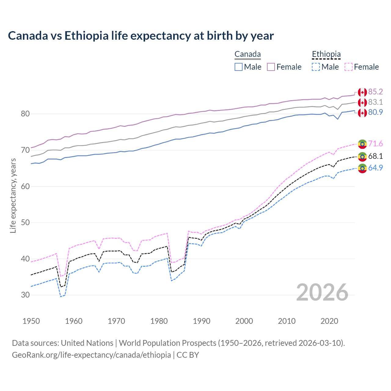 The average life expectancy at birth is 83.1 years in Canada vs 68.1 in Ethiopia. Canada is ranked 19/197 by life expectancy, and Ethiopia is 150/197. In Canada, the life expectancy is 80.9 years for males and 85.2 years for females. In Ethiopia, it's 64.9 years for males and 71.6 years for females.