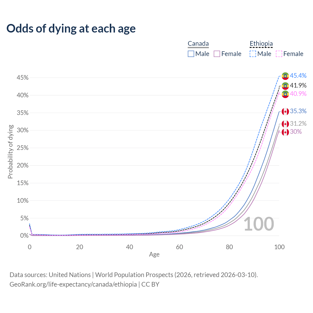This life expectancy calculator shows the odds of living to 100, 95, 90, and below based on current age for both males and females in Canada and Ethiopia, along with mean and median age of death. The calculations are based on the 2026 life tables (actuarial tables) from the UN World Population Prospects.