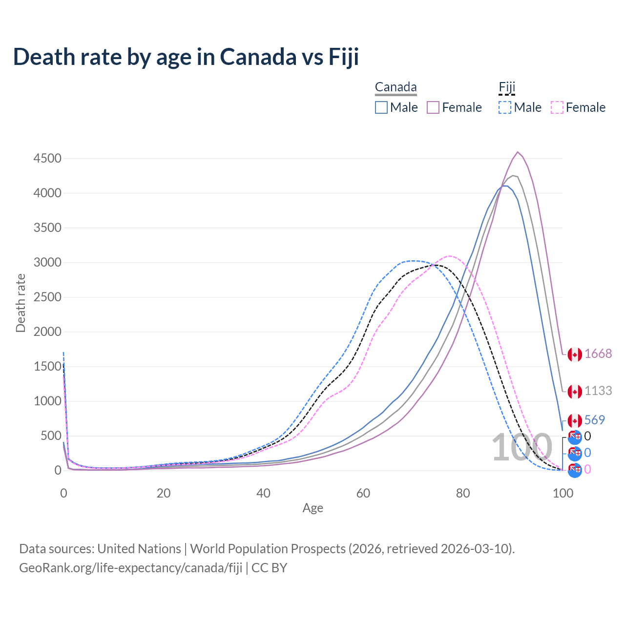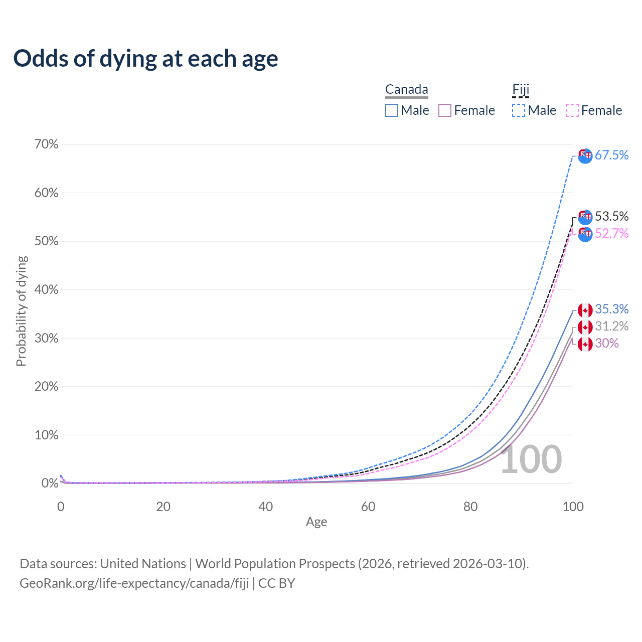 This life expectancy calculator shows the odds of living to 100, 95, 90, and below based on current age for both males and females in Canada and Fiji, along with mean and median age of death. The calculations are based on the 2026 life tables (actuarial tables) from the UN World Population Prospects.