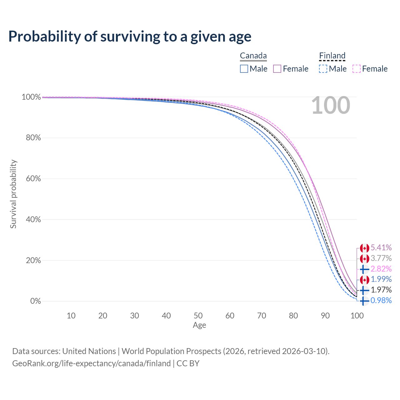 This life expectancy calculator shows the odds of living to 100, 95, 90, and below based on current age for both males and females in Canada and Finland, along with mean and median age of death. The calculations are based on the 2026 life tables (actuarial tables) from the UN World Population Prospects.