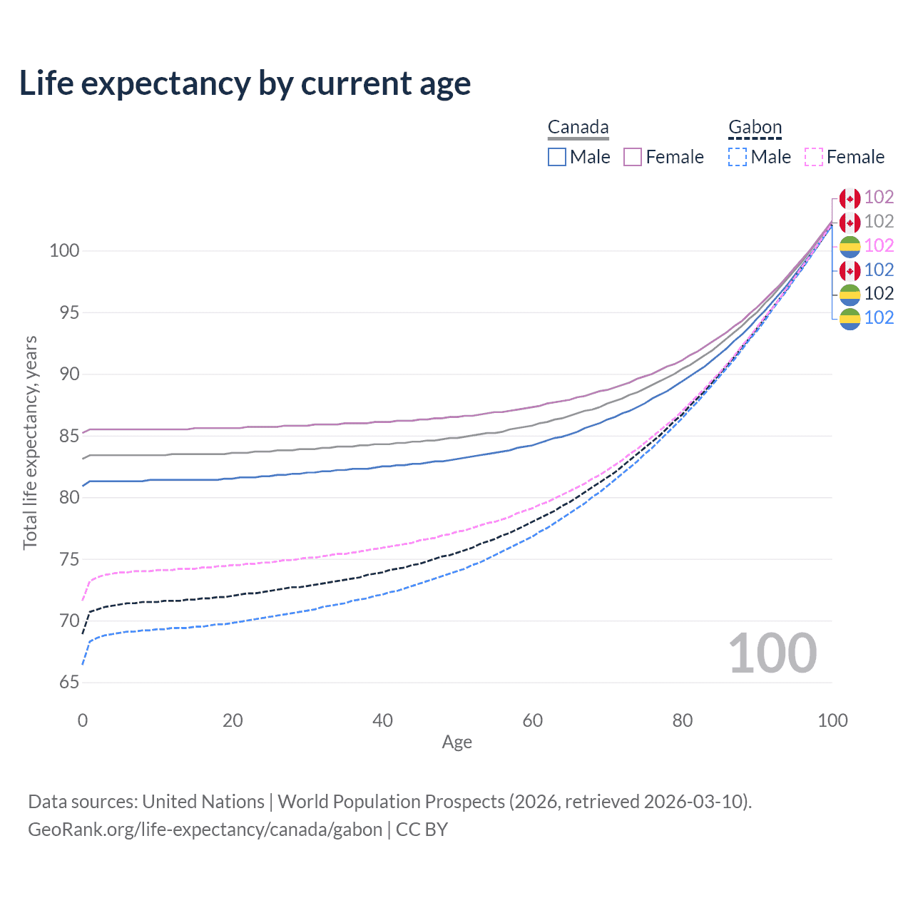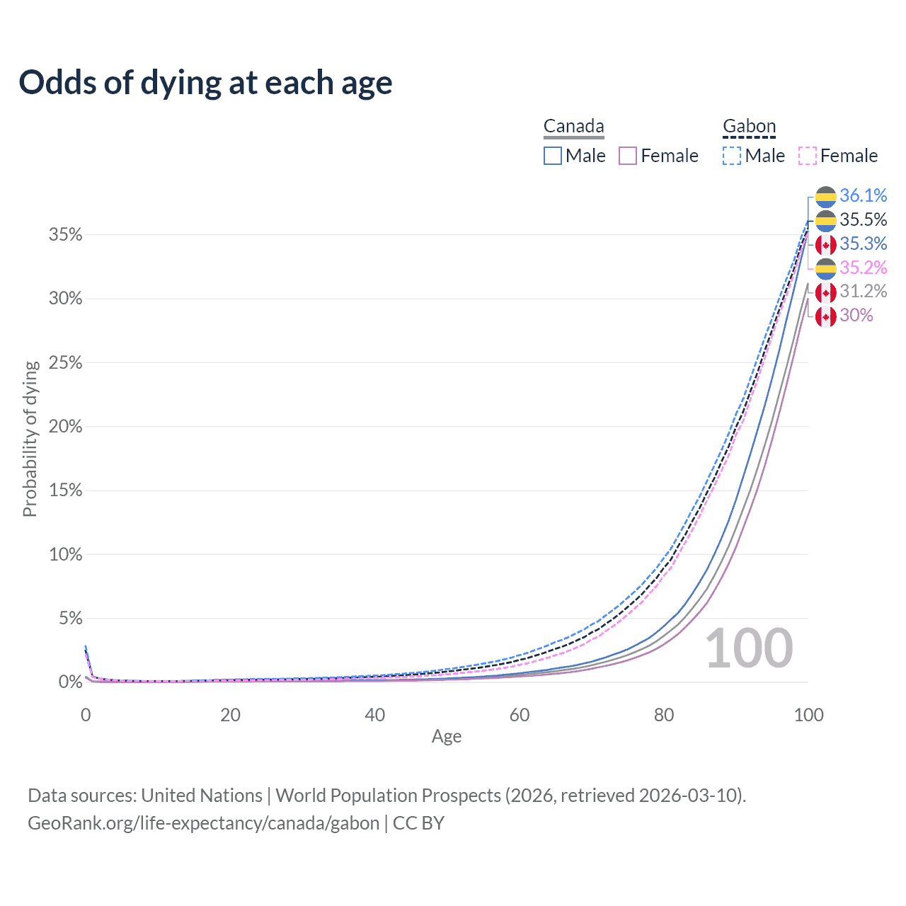 This life expectancy calculator shows the odds of living to 100, 95, 90, and below based on current age for both males and females in Canada and Gabon, along with mean and median age of death. The calculations are based on the 2026 life tables (actuarial tables) from the UN World Population Prospects.