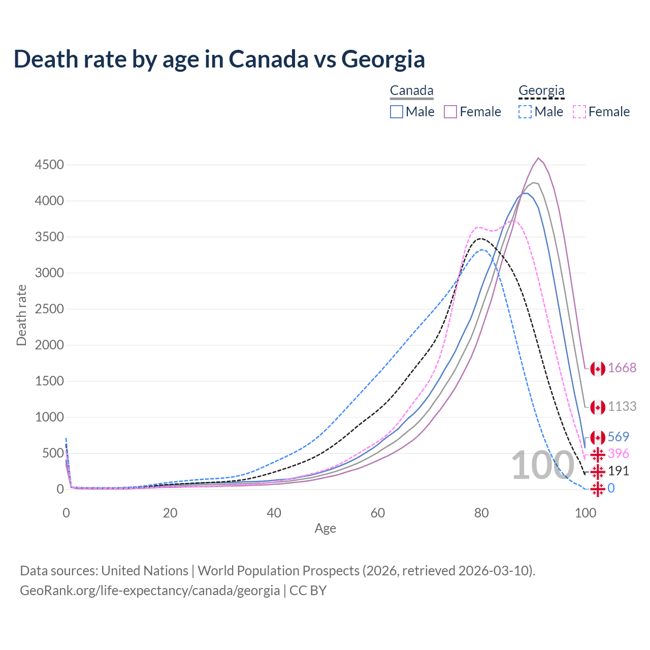 In Canada, the most common age of death is 90, compared to 80 in Georgia. The median age of death is 86.4 in Canada and 78.2 in Georgia, meaning only half of each cohort is expected to live past that age.