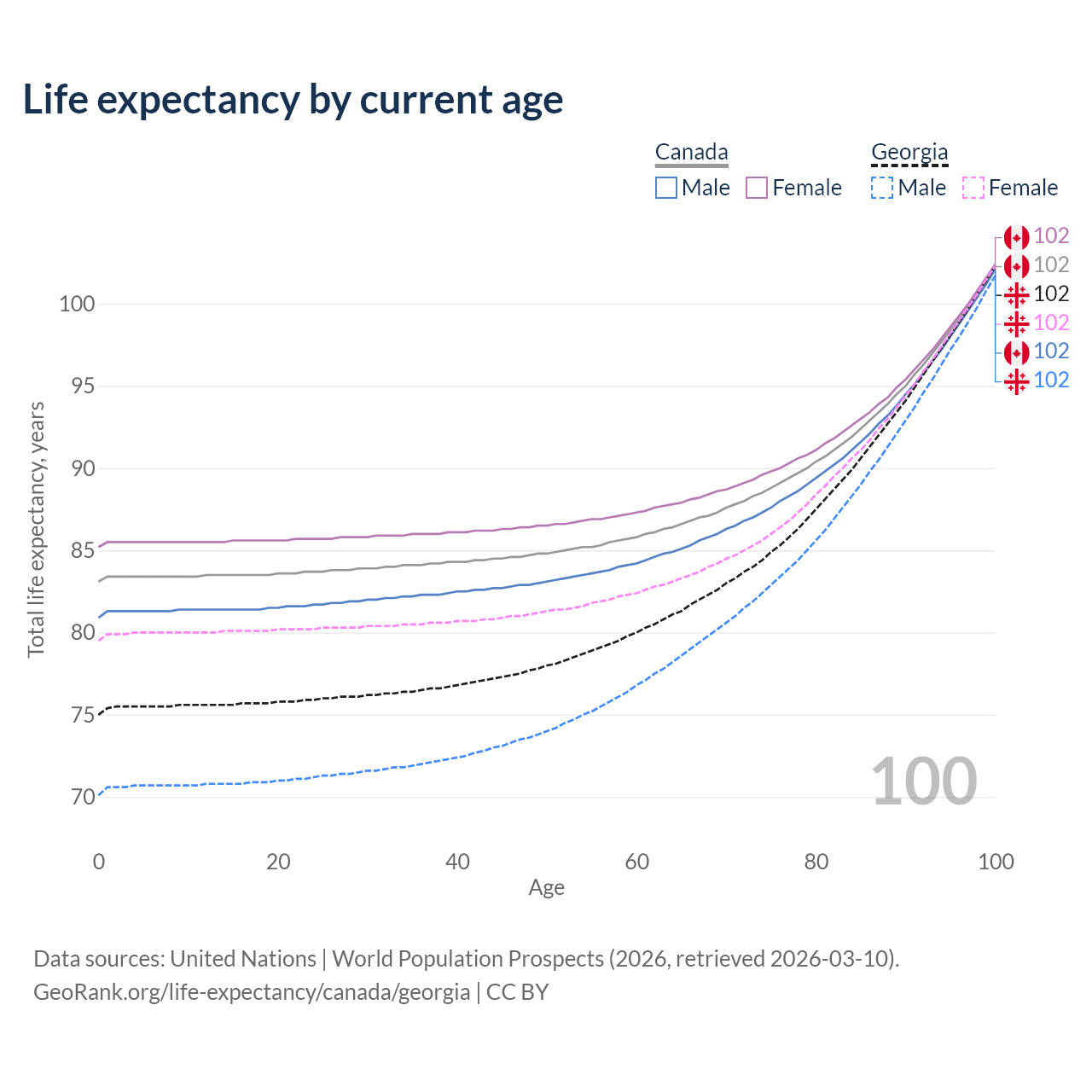 This life expectancy calculator shows the odds of living to 100, 95, 90, and below based on current age for both males and females in Canada and Georgia, along with mean and median age of death. The calculations are based on the 2026 life tables (actuarial tables) from the UN World Population Prospects.