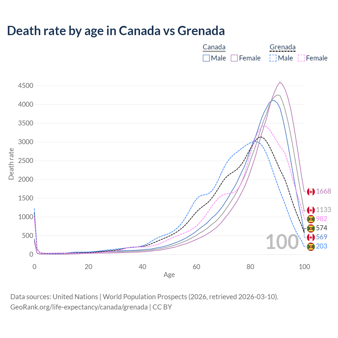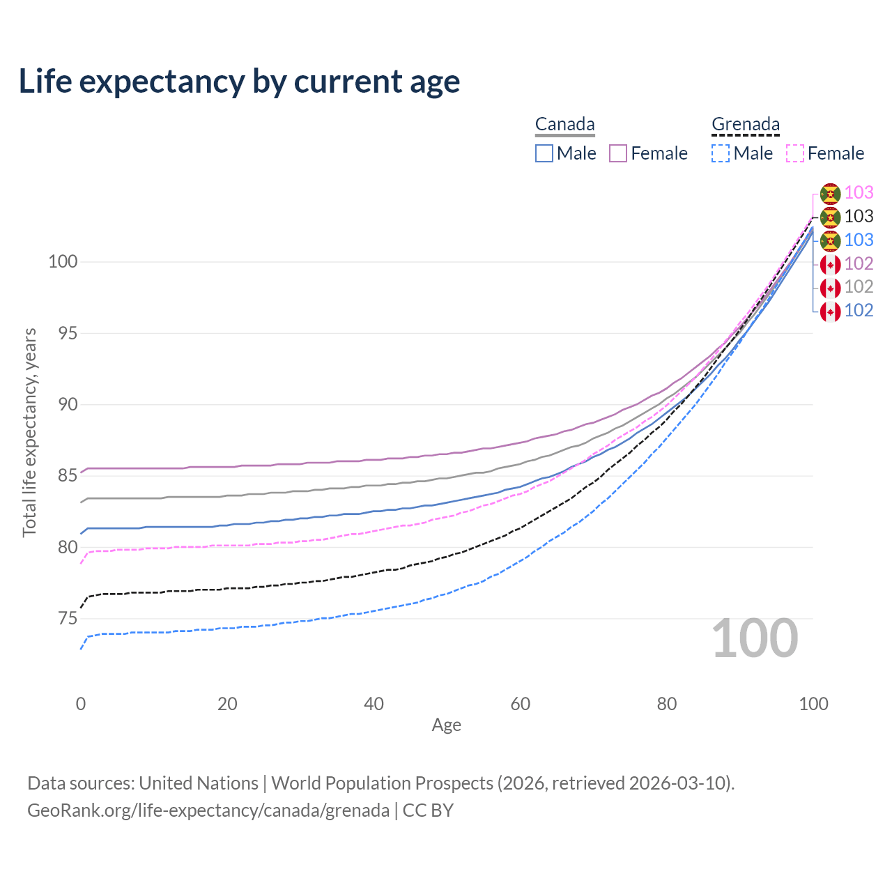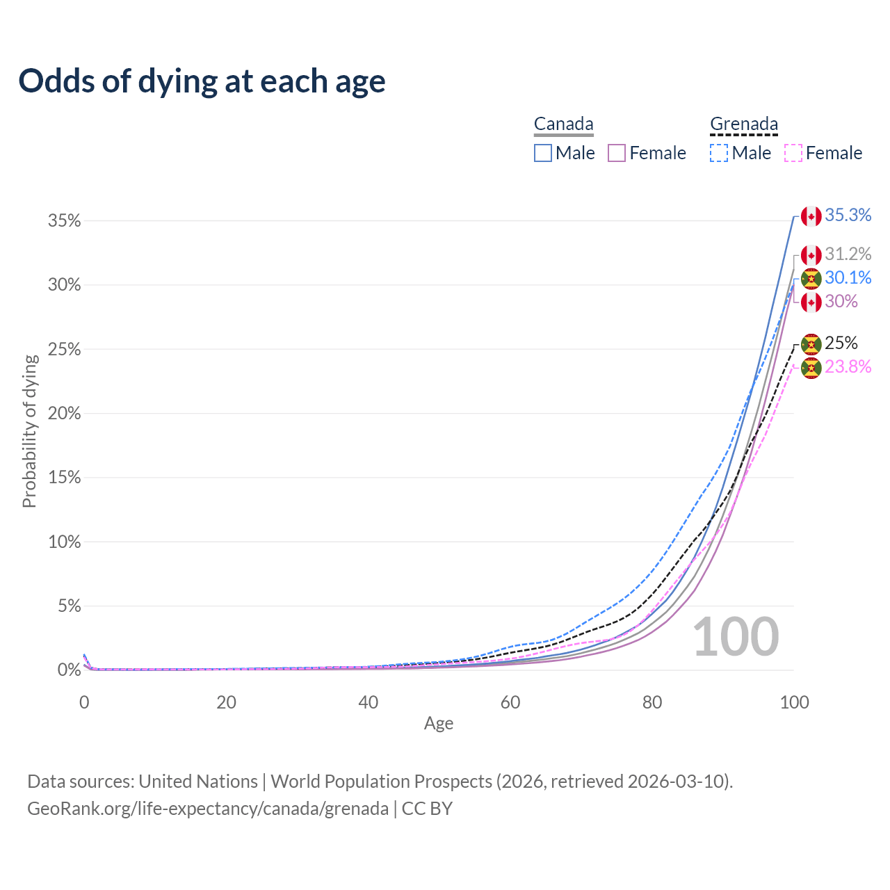 This life expectancy calculator shows the odds of living to 100, 95, 90, and below based on current age for both males and females in Canada and Grenada, along with mean and median age of death. The calculations are based on the 2026 life tables (actuarial tables) from the UN World Population Prospects.