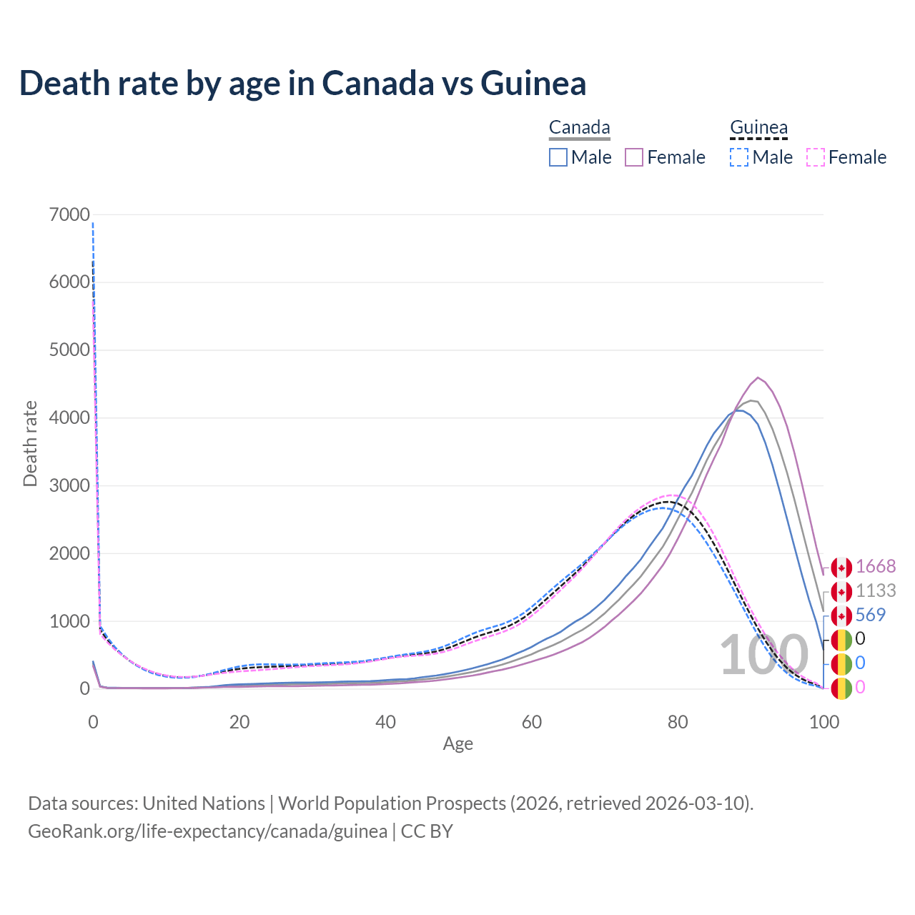 In Canada, the most common age of death is 90, compared to 0 in Guinea. The median age of death is 86.4 in Canada and 70.6 in Guinea, meaning only half of each cohort is expected to live past that age.