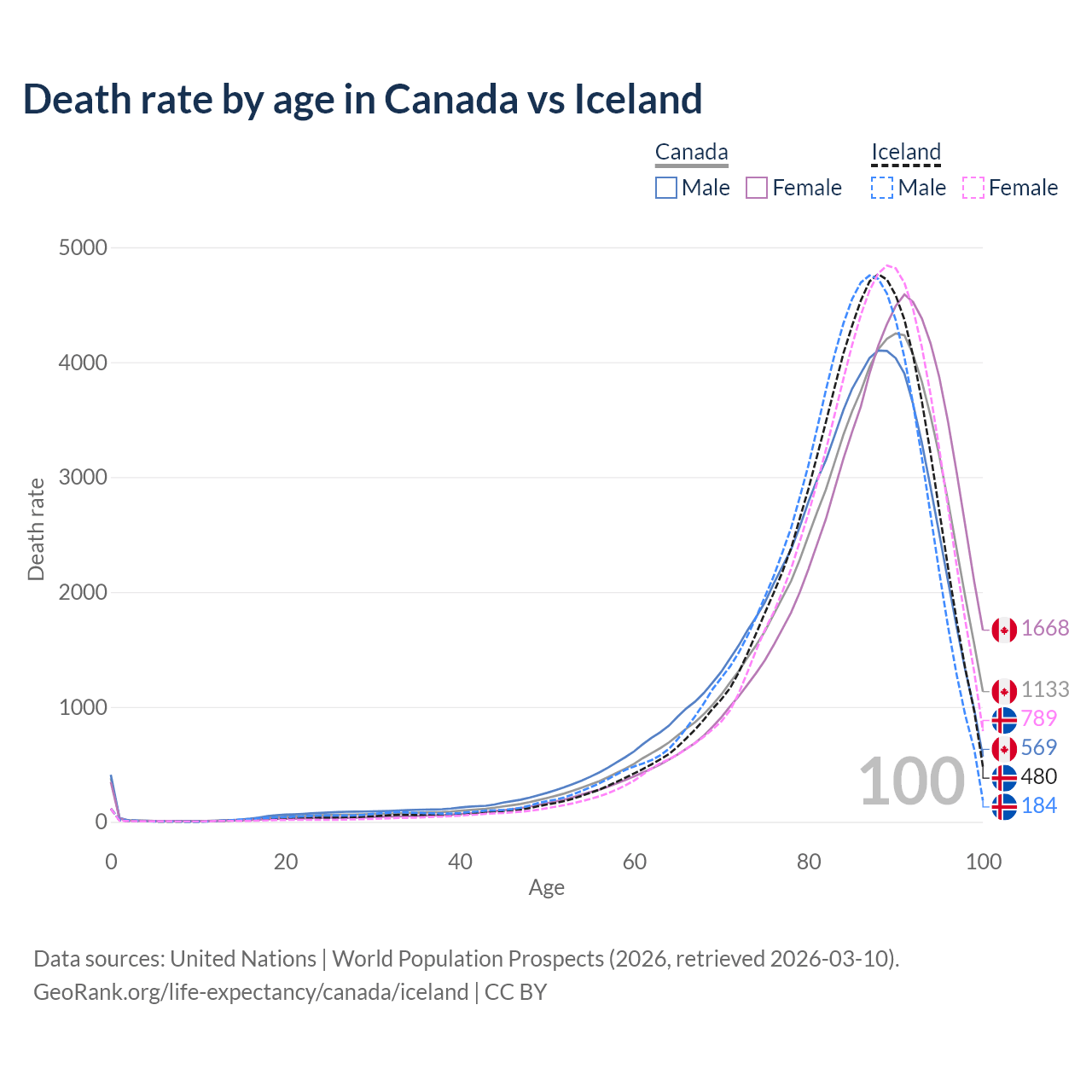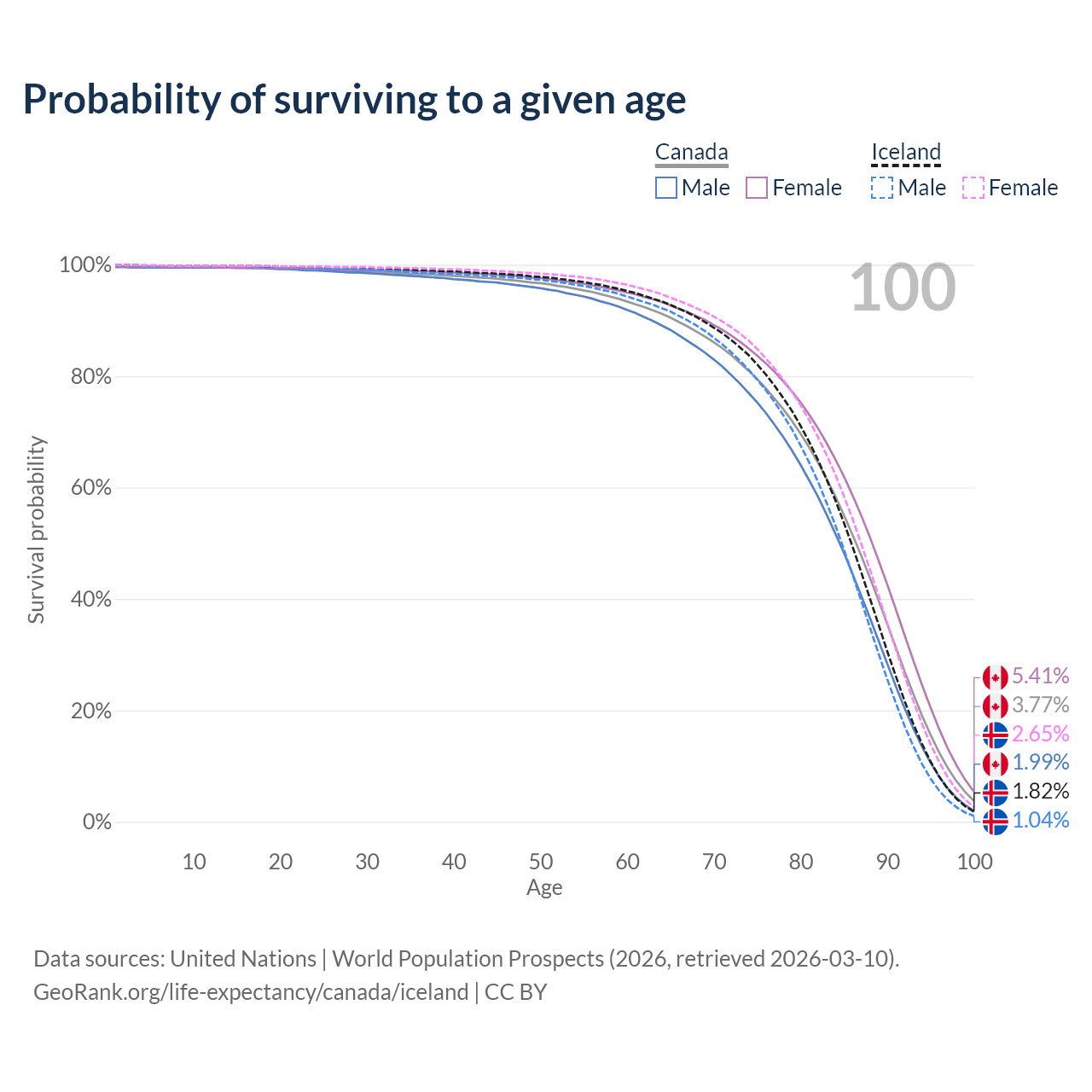 This life expectancy calculator shows the odds of living to 100, 95, 90, and below based on current age for both males and females in Canada and Iceland, along with mean and median age of death. The calculations are based on the 2026 life tables (actuarial tables) from the UN World Population Prospects.