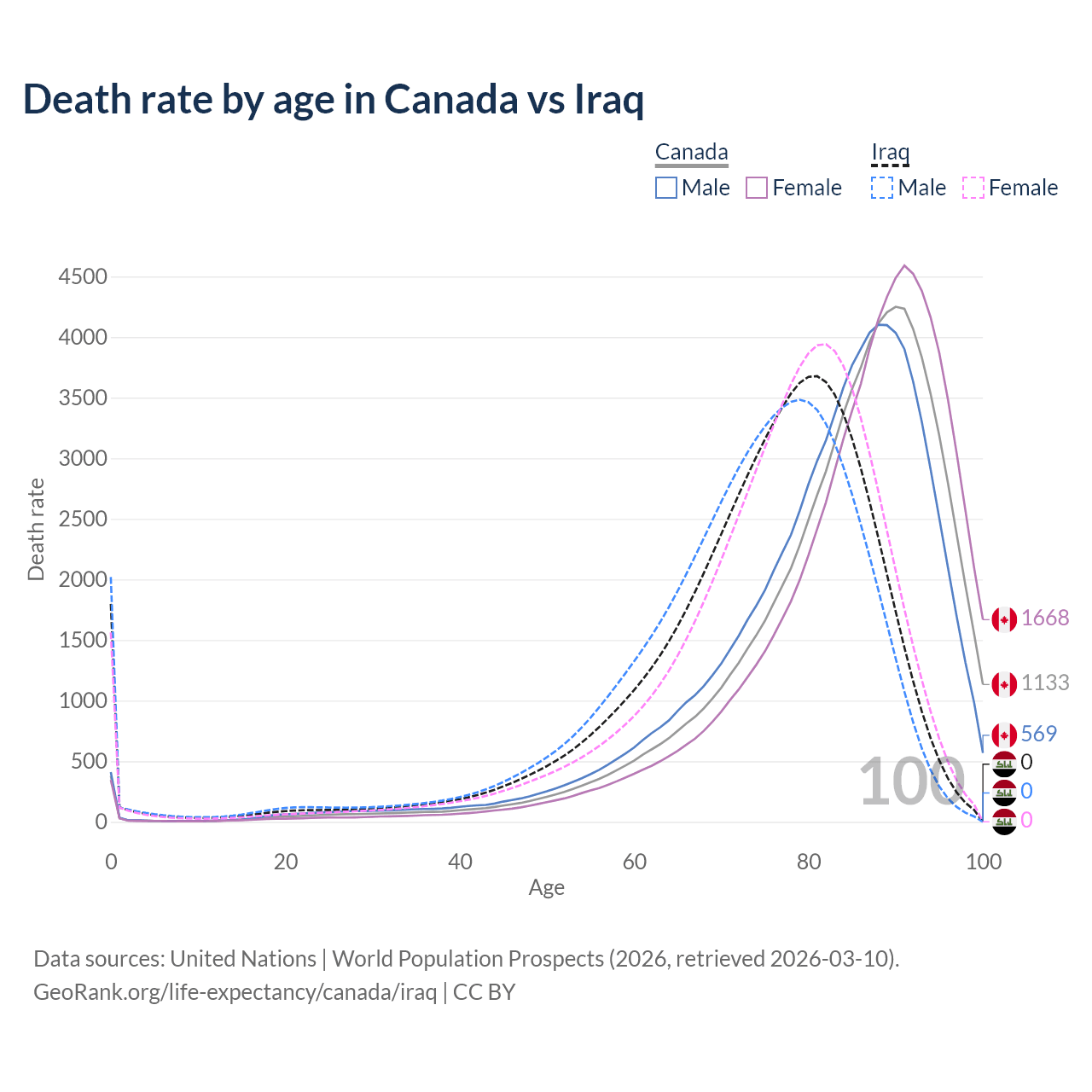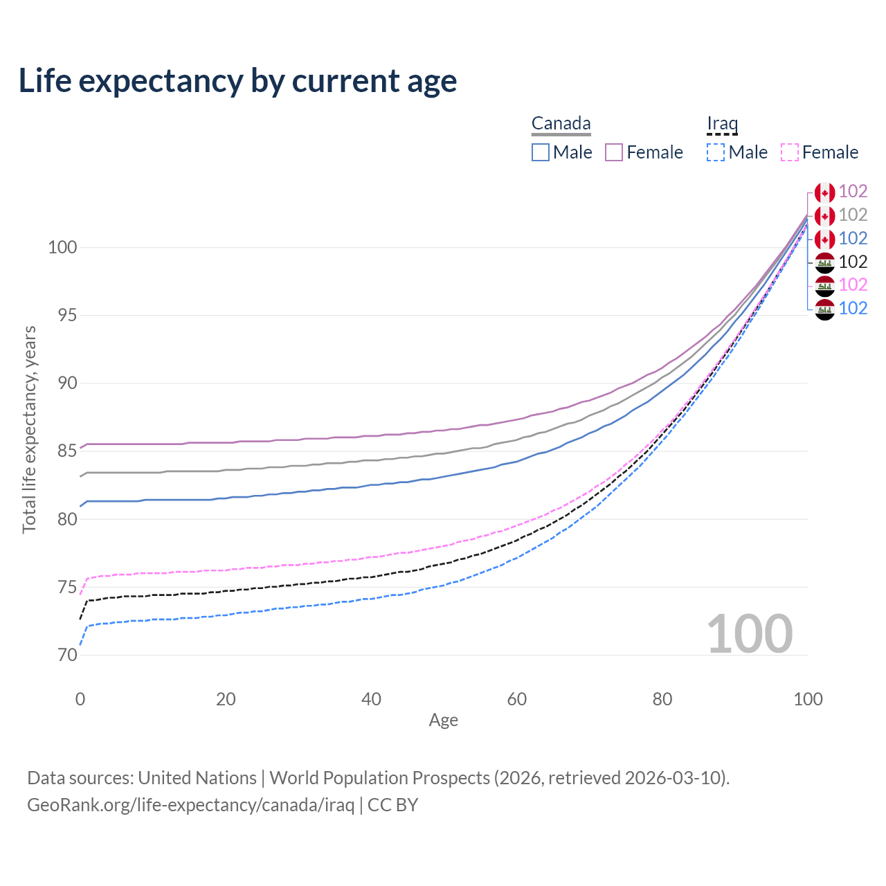 This life expectancy calculator shows the odds of living to 100, 95, 90, and below based on current age for both males and females in Canada and Iraq, along with mean and median age of death. The calculations are based on the 2026 life tables (actuarial tables) from the UN World Population Prospects.