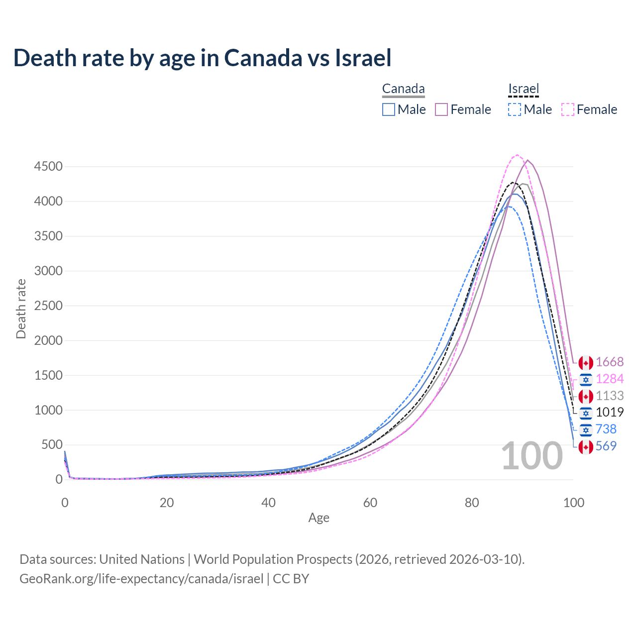 This life expectancy calculator shows the odds of living to 100, 95, 90, and below based on current age for both males and females in Canada and Israel, along with mean and median age of death. The calculations are based on the 2026 life tables (actuarial tables) from the UN World Population Prospects.