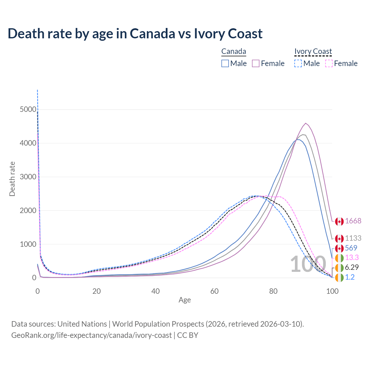 In Canada, the most common age of death is 90, compared to 0 in Ivory Coast. The median age of death is 86.4 in Canada and 68.6 in Ivory Coast, meaning only half of each cohort is expected to live past that age.