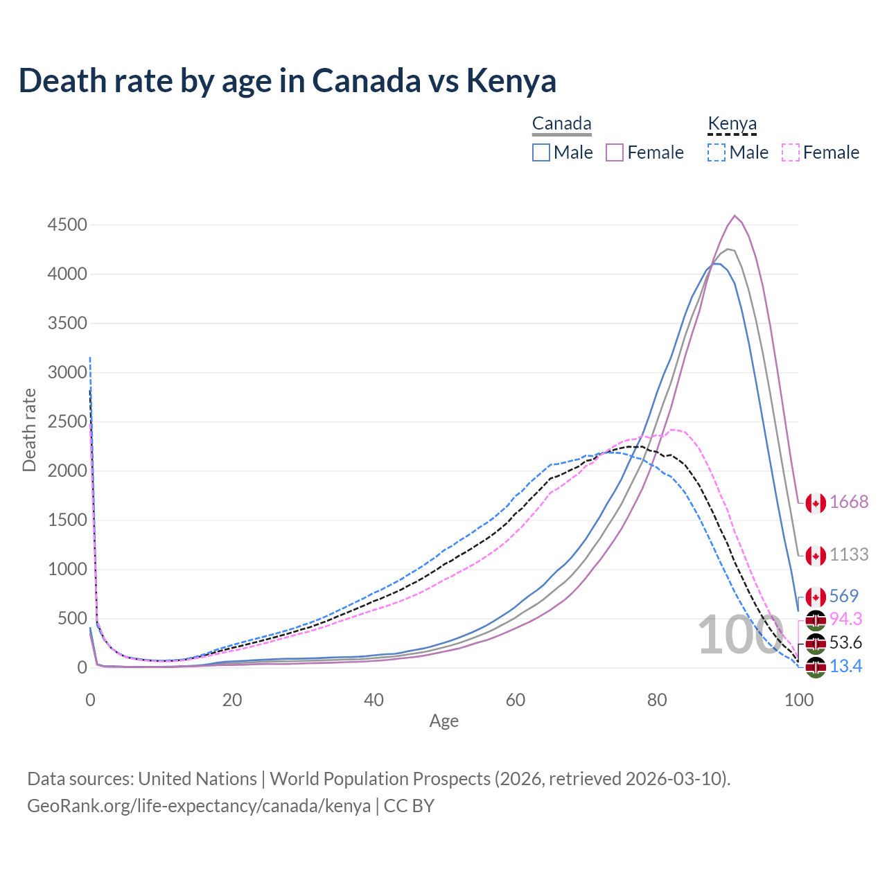 Note that this chart does not show rates per 100,000 population, as those would be skewed by age structure differences and reflect the demographics of Canada and Kenya more than their death rates.