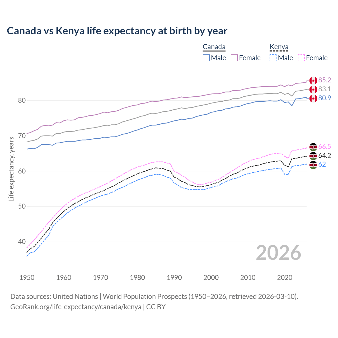 The average life expectancy at birth is 83.1 years in Canada vs 64.2 in Kenya. Canada is ranked 19/197 by life expectancy, and Kenya is 177/197. In Canada, the life expectancy is 80.9 years for males and 85.2 years for females. In Kenya, it's 62 years for males and 66.5 years for females.