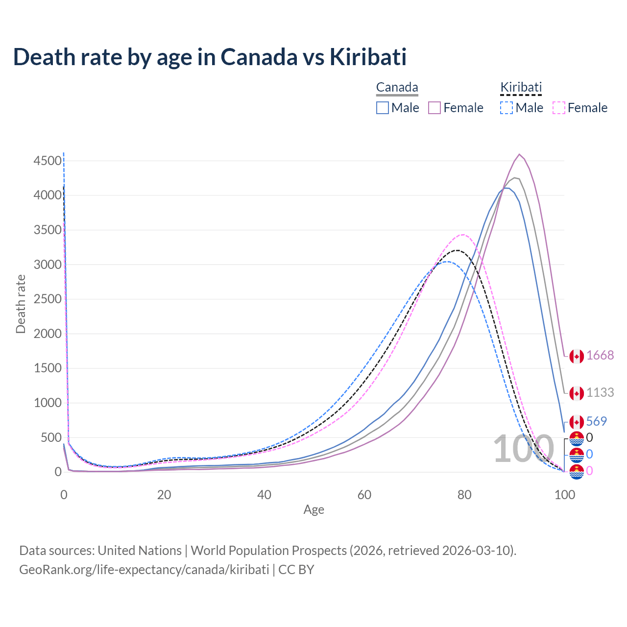 In Canada, the most common age of death is 90, compared to 0 in Kiribati. The median age of death is 86.4 in Canada and 73.1 in Kiribati, meaning only half of each cohort is expected to live past that age.