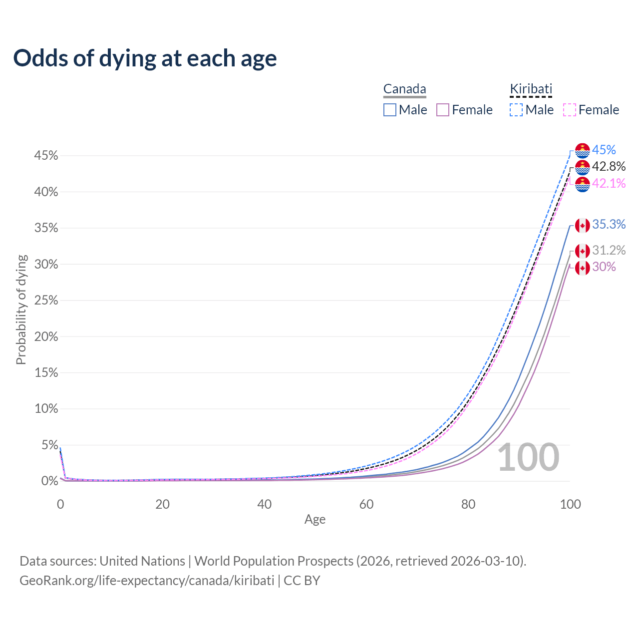 This life expectancy calculator shows the odds of living to 100, 95, 90, and below based on current age for both males and females in Canada and Kiribati, along with mean and median age of death. The calculations are based on the 2026 life tables (actuarial tables) from the UN World Population Prospects.