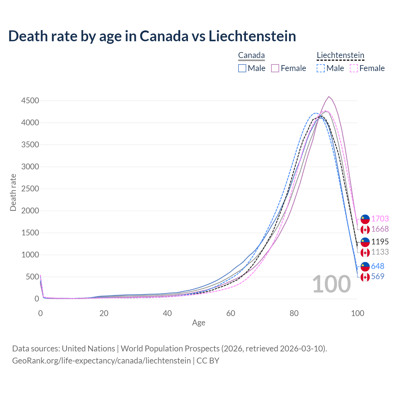 In Canada, the most common age of death is 90, compared to 89 in Liechtenstein. The median age of death is 86.4 in Canada and 86.3 in Liechtenstein, meaning only half of each cohort is expected to live past that age.