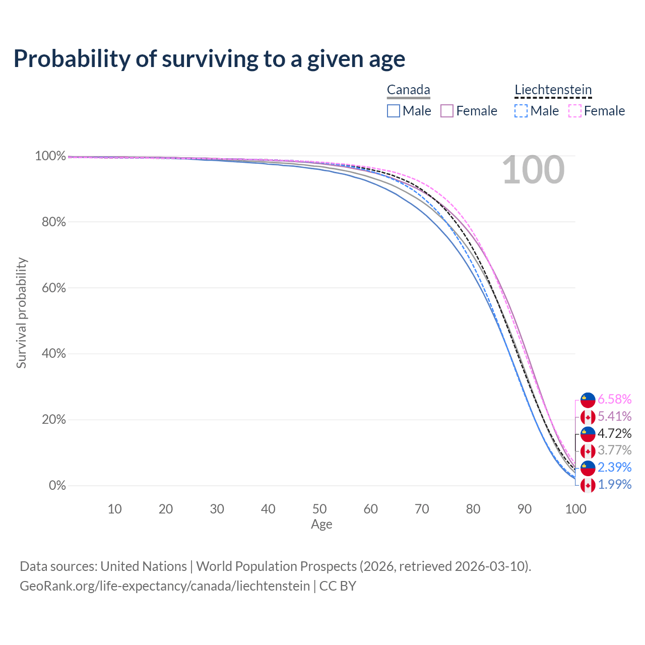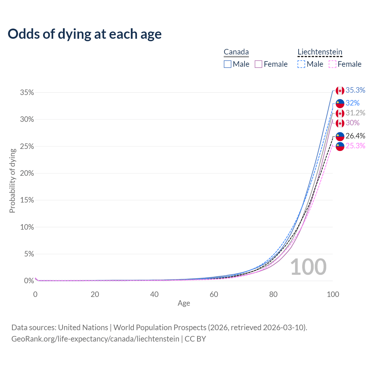 This life expectancy calculator shows the odds of living to 100, 95, 90, and below based on current age for both males and females in Canada and Liechtenstein, along with mean and median age of death. The calculations are based on the 2026 life tables (actuarial tables) from the UN World Population Prospects.