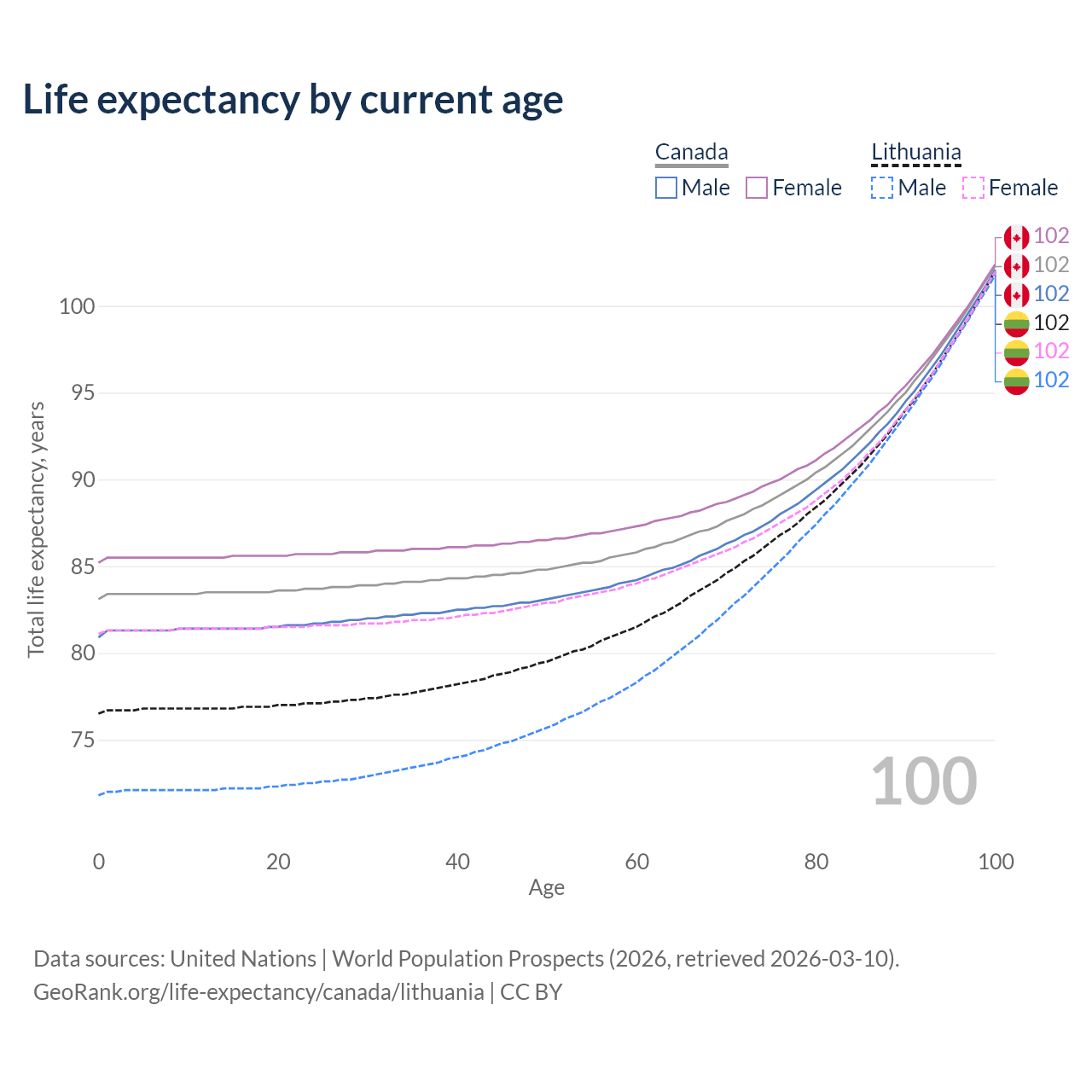 This life expectancy calculator shows the odds of living to 100, 95, 90, and below based on current age for both males and females in Canada and Lithuania, along with mean and median age of death. The calculations are based on the 2026 life tables (actuarial tables) from the UN World Population Prospects.