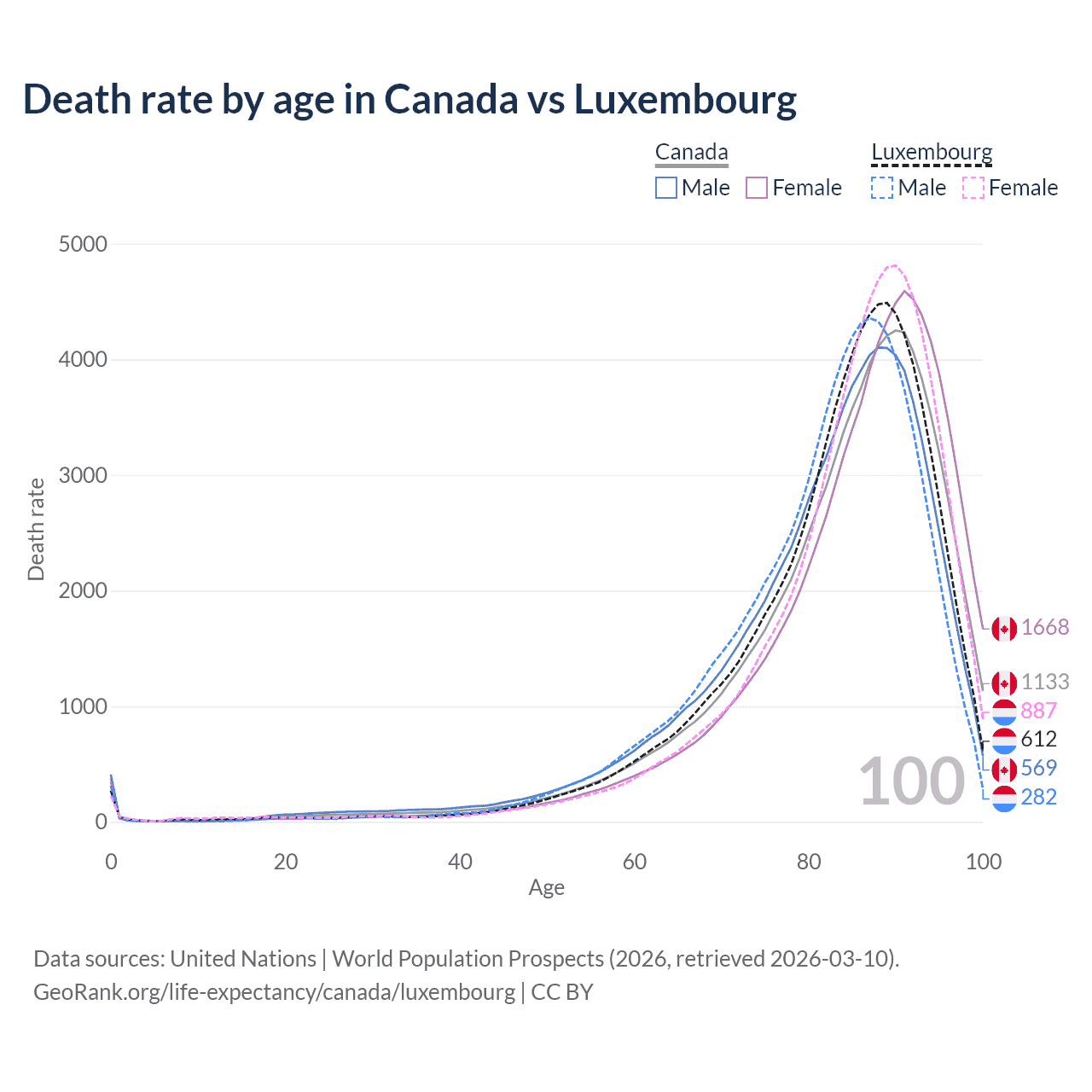 This life expectancy calculator shows the odds of living to 100, 95, 90, and below based on current age for both males and females in Canada and Luxembourg, along with mean and median age of death. The calculations are based on the 2026 life tables (actuarial tables) from the UN World Population Prospects.